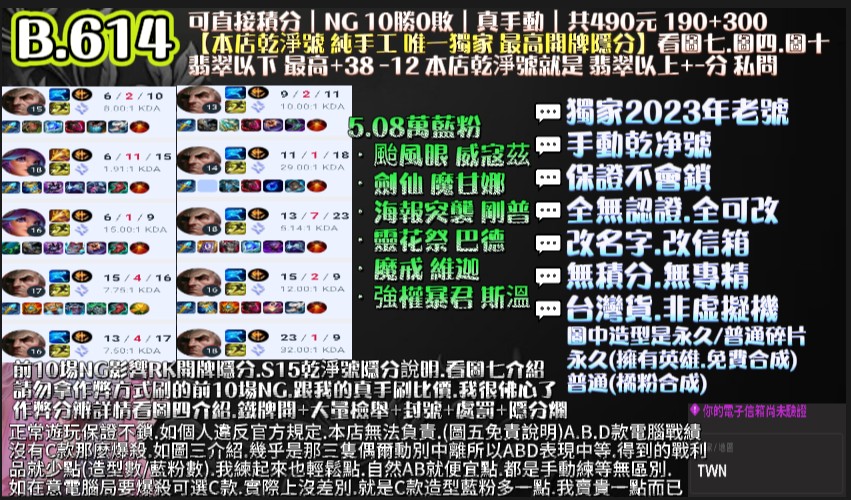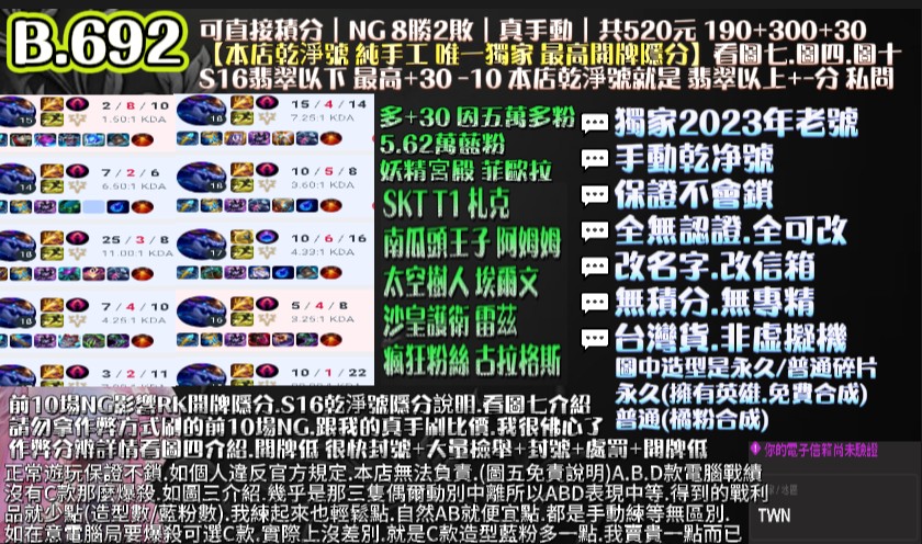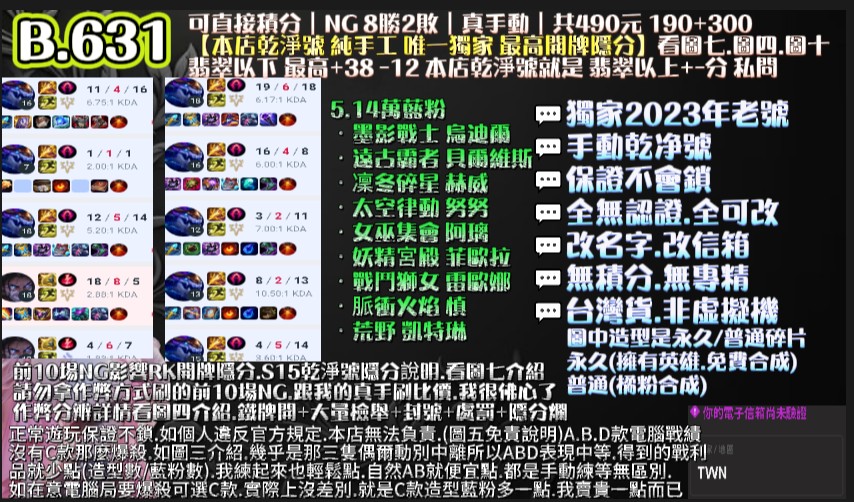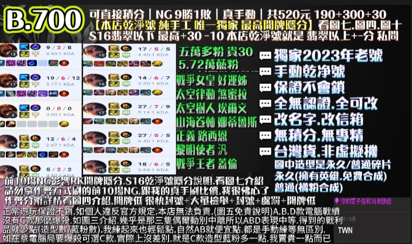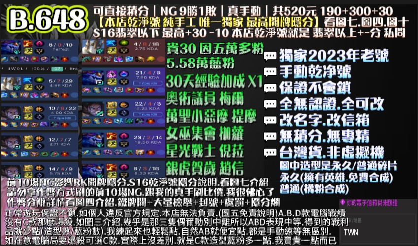 | 代刷10場NG保8勝+10把好KDA.即可拉高開牌隱分 |