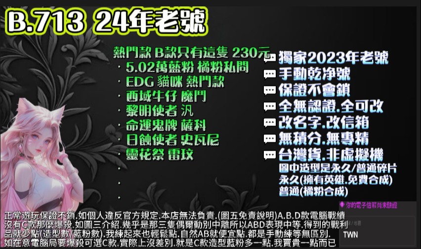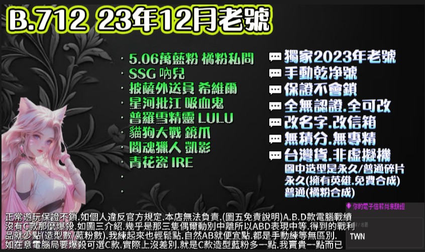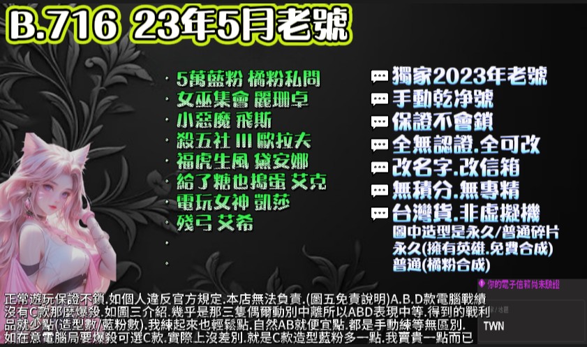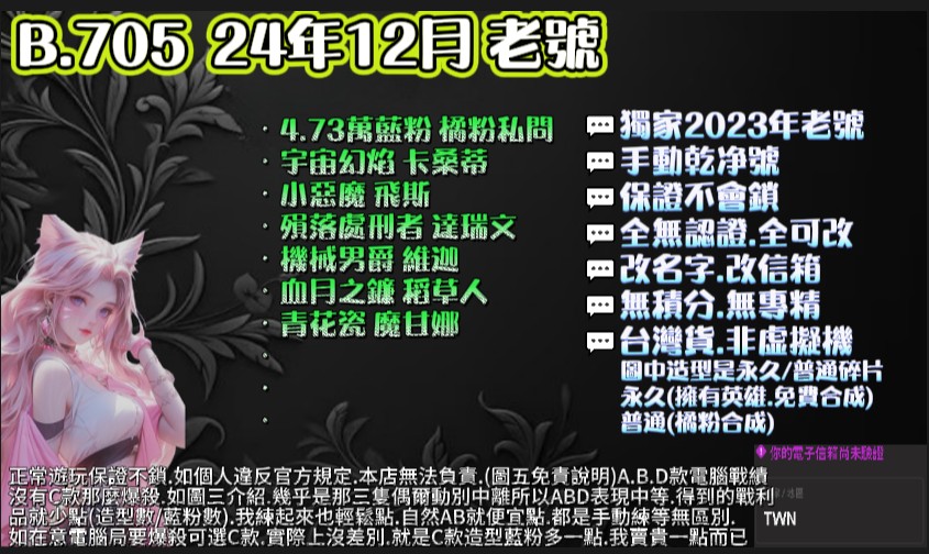 | 30等.4萬粉.4~7造型.3~6英雄.可挑造型.此賣場有圖可看 |