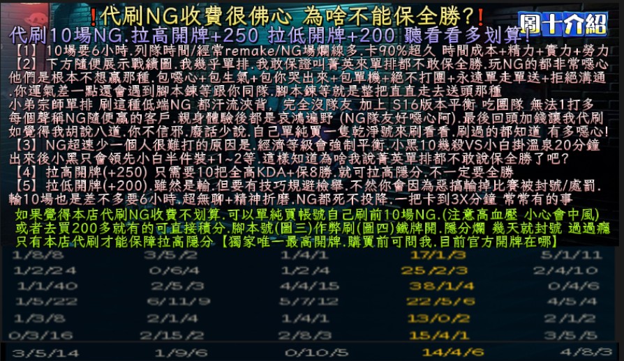 | 真手工代刷10場NG 好KDA+保8勝+6小時=拉高開牌隱分 |