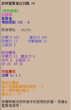 【+9武林聖賢者白羽扇(攻12魔6命8必4HP2%AP3%)(治療+1)(DG發條4等增智+75魔)】