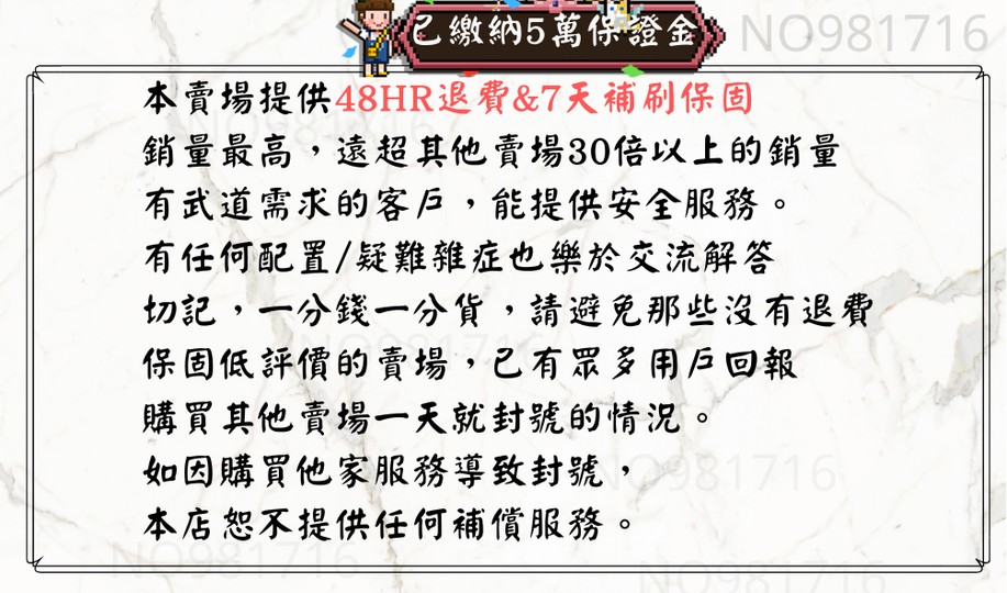 - 若因其他賣場操作導致封號,本店恕不負責。