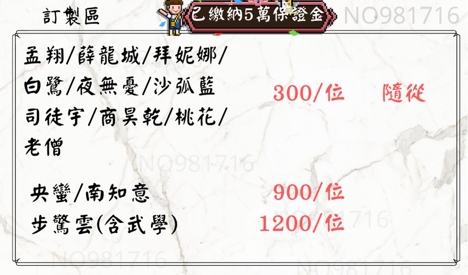 - 挑戰項目 (1100 - 1500﹩): 聞香教、霸者鬥宴、武神殿宿命 (要魚腸劍額外 +500﹩)