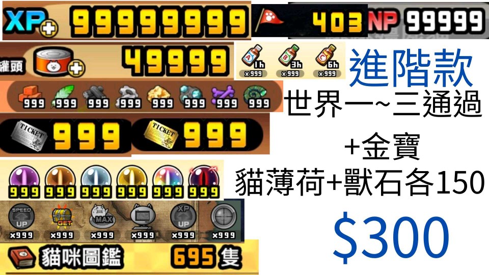 基礎款 罐頭40000 xp99999999 貓眼石各500 喵力達各500 金卷500 銀卷999 素材各1000 首領旗200 道具各999 可買帳號,也可以把你的帳號給我改
