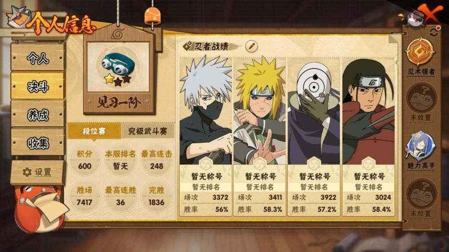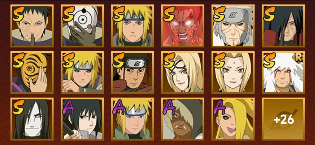 水門,穢土水門,大蛇丸,百豪綱手,綱手,死門凱,穢土扉間,柱間,神秘面具男,忍戰帶土,穢土斑,舞之豪傑自來也,白面具,青年水門,博人傳達魯伊,穢土迪達拉,曉大蛇丸,地陸,飛段,死司飛段,鬼鮫,博人傳黑土,角都,地怨虞角都,凱,萬花筒卡卡西,奇拉比,忍戰奇拉比,忍戰丁次,近松十人衛千代,疾風傳我愛羅,忍戰我愛羅,桃式顯現博人,蠍,仙人鳴人,九尾鳴人,阿斯瑪,止水,萬花筒佐助,博人傳木葉丸,須佐佐助,斗篷兜,最終章雛田