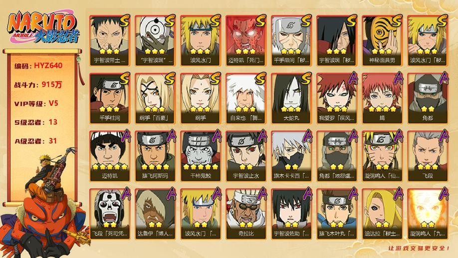 【HYZ640】V5/戰力915W/S忍13/A忍31/通靈獸16/水門/穢土水門/大蛇丸/百豪綱手/綱手/死門凱/穢土扉間/柱間/神秘面具男/忍戰帶土/穢土斑/舞之豪傑自來也/白面具/青年水門/博人傳達魯伊/穢土迪達拉/曉大蛇丸/地陸/飛段/死司飛段/鬼鮫/博人傳黑土/角都/地怨虞角都/凱/萬花筒卡卡西/奇拉比/忍戰奇拉比/忍戰丁次/近松十人衛千代/疾風傳我愛羅/忍戰我愛羅/桃式顯現博人/蠍/仙