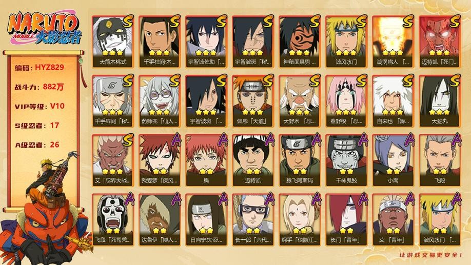 【HYZ829】V10/戰力882W/S忍17/A忍26/水門/忍戰櫻/博人傳桃式/忍戰大野木/大蛇丸/死門凱/天道/創立柱間/穢土扉間/紅夜帶土/九鳴人/永恆萬花筒佐助/穢土解斑/仙人兜/創立斑/舞之豪傑自來也/忍戰艾/青年艾/青年水門/博人傳達魯伊/穢土迪達拉/飛段/死司飛段/鬼鮫/俠隱綱手/博人傳黑土/凱/漂泊六道/奇拉比/忍戰丁次/近松十人衛千代/忍戰寧次/忍者之路面具男/疾風傳我愛羅/桃