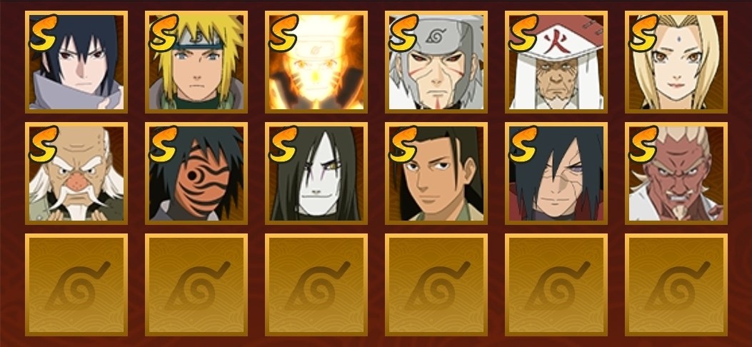 水門,忍戰大野木,大蛇丸,綱手,創立柱間,穢土扉間,紅夜帶土,九喇嘛鳴人,永恆萬花筒佐助,穢土解斑,三代火影,忍戰艾