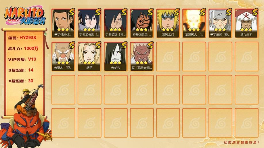 【HYZ938】V10/戰力1000W/S忍14/A忍30/水門/忍戰大野木/大蛇丸/綱手/創立柱間/穢土扉間/紅夜帶土/九鳴人/永恆萬花筒佐助/穢土解斑/三代火影/忍戰艾