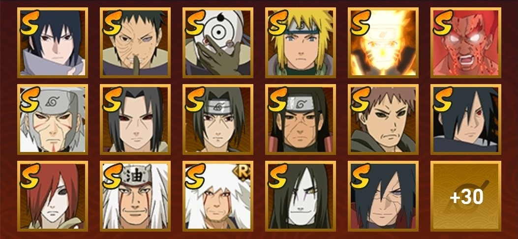 穢土長門,穢土扉間,穢土柱間,穢土鼬,穢土解斑,忍戰帶土,須佐鼬,創立斑,四代風影,自來也,舞之豪傑自來也,大蛇丸,水門,九喇嘛鳴人,死門凱,永恆萬花筒佐助,白面具,青年艾,不緣,不風,青年水門,百豪櫻,迪達拉,穢土迪達拉,曉大蛇丸,飛段,死司飛段,鬼鮫,凱,奇拉比,忍戰奇拉比,忍戰丁次,近松十人衛千代,忍戰寧次,疾風傳我愛羅,忍戰我愛羅,桃式顯現博人,蠍,小南,阿斯瑪,止水,鼬,萬花筒佐助,須佐佐助,六代水影,青年長門,五代水影