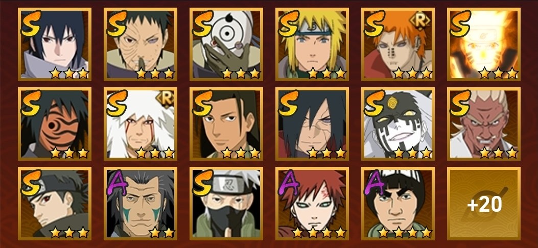 九喇嘛鳴人,永恆萬花筒佐助,舞之豪傑自來也,水門,創立柱間,穢土解斑,須佐止水,白面具,忍戰帶土,紅夜帶土,忍戰艾,天道佩恩,天道超,博人傳桃式,凱,阿斯瑪,疾風傳我愛羅,鬼鮫,萬花筒佐助,須佐佐助,忍戰寧次,忍戰李,最終章雛田,新春水門,青年水門,新春我愛羅,奇拉比,不動,青年長門,漂泊六道,漂泊小南,蠍,新春鼬,死司飛段,六代水影,桃式顯現博人,須佐卡卡西