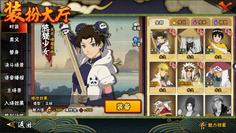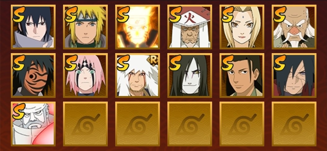 大蛇丸,九喇嘛鳴人,永恆萬花筒佐助,忍戰櫻,舞之豪傑自來也,綱手,水門,三代火影,創立柱間,穢土解斑,紅夜帶土,忍戰大野木,金式
