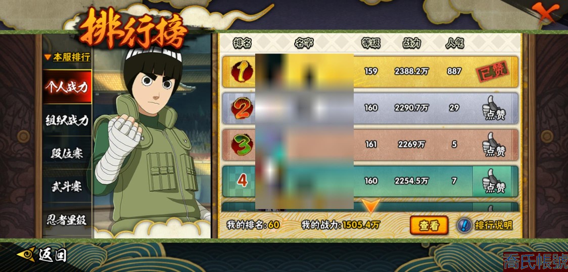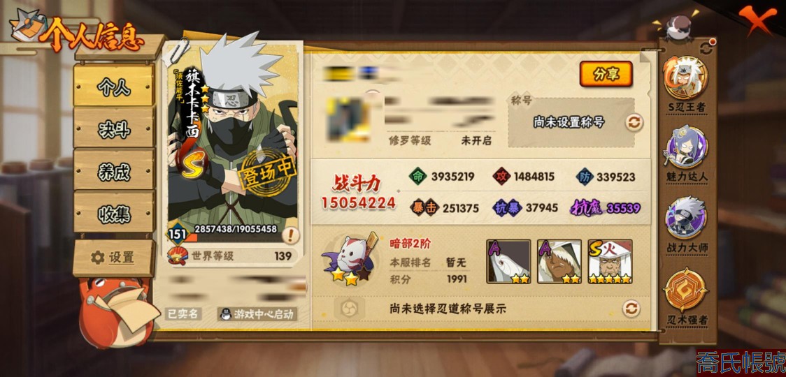 【11等】戰鬥力:1505W+;段位:暗部2階;本服排名:60;戰區排名:未上榜;VI