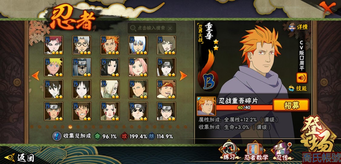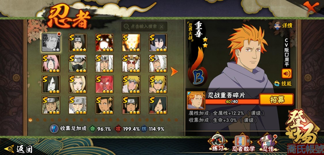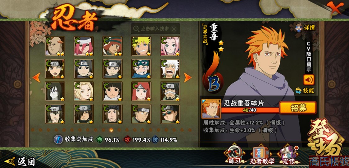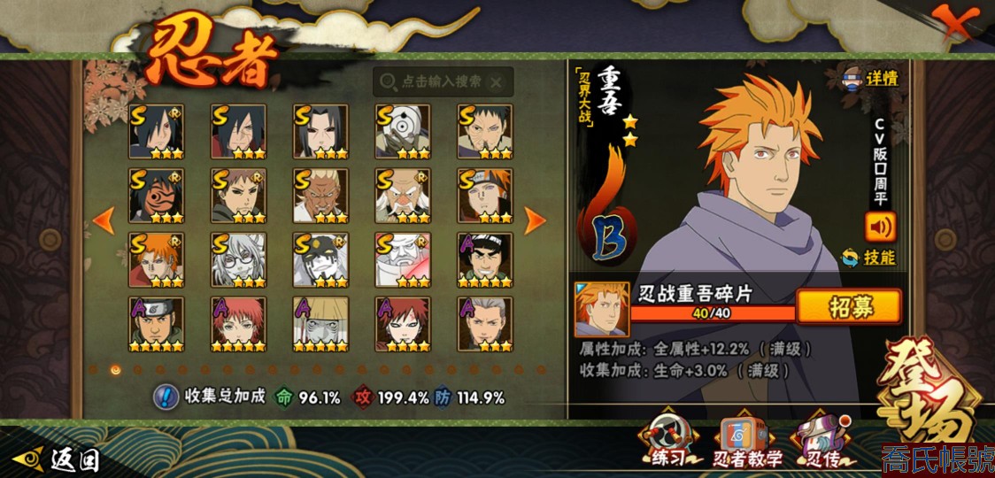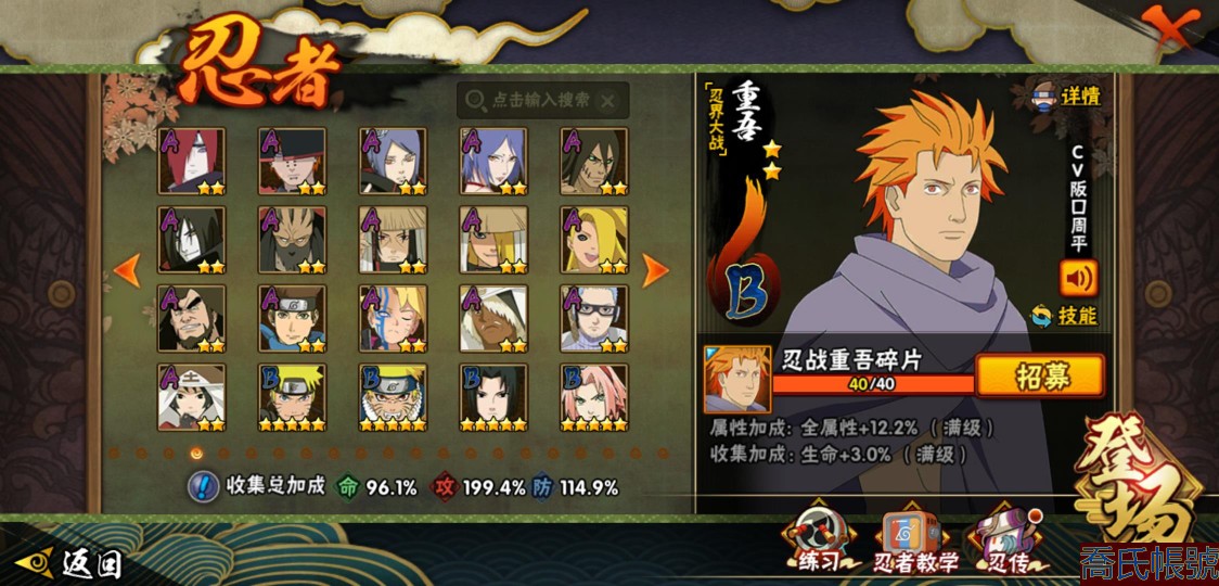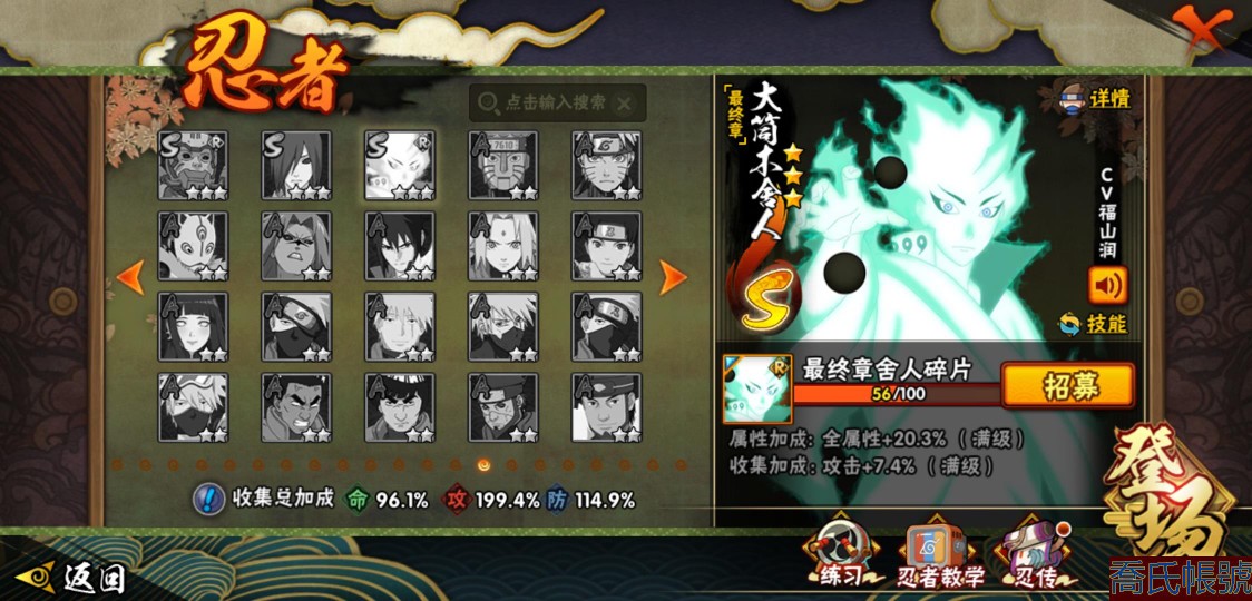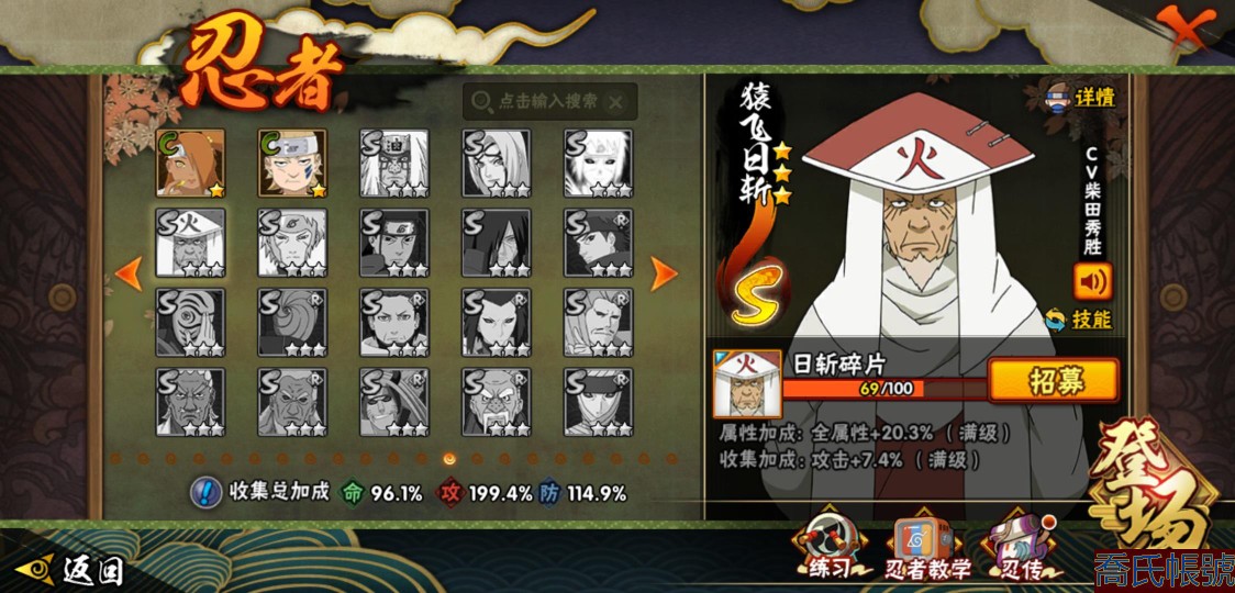 【OBHXDNK490442】戰鬥力:1539W+;段位:下忍3階;本服排名:193;戰區排名:未上榜;VIP12級;S忍33個;A忍42個;通靈獸24個;S忍:須佐能乎宇智波鼬(4星),暴怒第六尾漩渦鳴人,九喇嘛連結漩渦鳴人,永恆萬花筒宇智波佐助,忍界大戰春野櫻,須佐能乎旗木卡卡西,自來也,舞之豪傑自來也,傳說中的三忍自來也,大蛇丸,綱手,死門邁特凱,波風水門,穢土轉生波風水門,穢土轉生猿飛日斬,穢土轉生千手扉間,木葉創立千手柱間,穢土轉生千手柱間,宇智波斑,木葉創立宇智波斑,穢土轉生解宇智波斑,穢土轉生宇智波鼬,白面具宇智波斑,忍界大戰宇智波帶土,紅夜之刃神秘面具男,四代目風影羅砂,忍界大戰艾,忍界大戰大野木,天道佩恩,超佩恩天道,仙人模式藥師兜,大筒木桃式,大筒木金式;A忍:邁特凱(5星),猿飛阿斯瑪(5星),蠍(5星),幹柿鬼鮫(5星),疾風傳我愛羅(4星),飛段(3星),死司憑血飛段(3星),九尾查克拉漩渦鳴人,萬花筒寫輪眼宇智波佐助,須佐能乎宇智波佐助,宇智波泉奈,忍界大戰秋道丁次,忍界大戰日向寧次,忍界大戰李洛克,宇智波止水,青年波風水門,忍界大戰我愛羅,近松十人衛千代,五代目水影照美冥,穢土轉生桃地再不斬,奇拉比,忍界大戰奇拉比,青年艾,忍界大戰土臺,半蛇斗篷藥師兜,不緣,青年長門,漂泊浪客佩恩六道,小南,漂泊浪客小南,穢土轉生角都,曉大蛇丸,緋流琥蠍,宇智波鼬,迪達拉,穢土轉生迪達拉,羈絆神農,猿飛木葉丸,桃式顯現漩渦博人,五代目雷影達魯伊,六代目水影長十郎,四代目土影黑土;通靈獸:忍犬,藍蛇,蛤蟆吉,忍龜,鐮鼬,猿魔,砂之守鶴,山椒魚,蜃,蛤蟆仙人,鮫鯊,蛤蟆健,熊貓,蛞蝓,烏鴉,二尾又旅,,蛤蟆龍,蛤蟆廣,萬蛇,夢貘,鵺,鷹,蜘蛛;時裝:百戰佩恩天道,百戰大蛇丸,蜀面豪傑舞之豪傑自來也,百戰波風水門,百戰宇智波鼬須佐能乎,太極靈韻日向花火武當宗師,風之守護我愛羅忍界大戰,驚雷掠影達魯伊五代目雷影,血霧怪人幹柿鬼鮫,烈土霓裳黑土四代目土影,編織虛實宇智波鼬,緋櫻綻放春野櫻百豪,水之妖姬照美冥五代目水影,剎那的藝術迪達拉,熊貓少女天天峨眉宗師,傳說的光芒波風水門,龍的傳人李洛克截拳宗師;【1216】