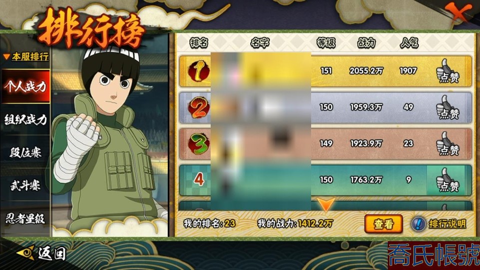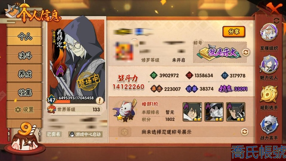 【11等】戰鬥力:1412W+;段位:暗部1階;本服排名:23;戰區排名:未上榜;VI