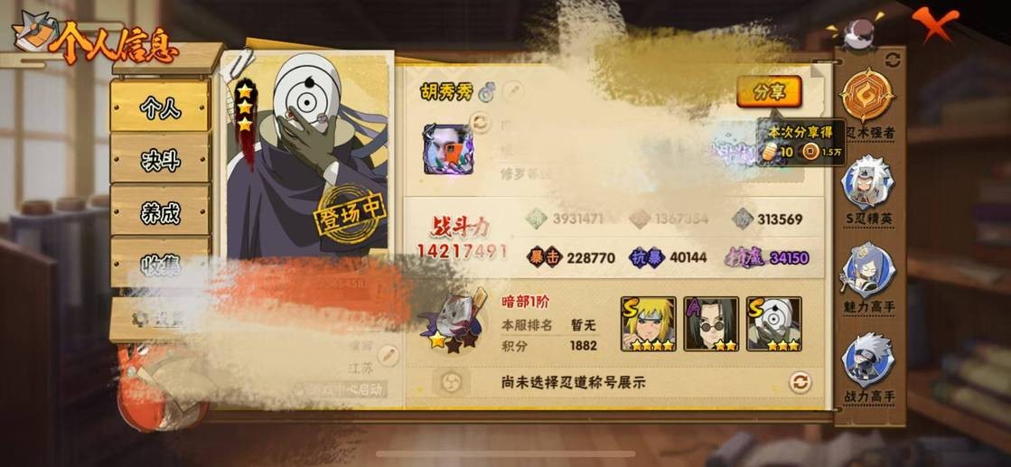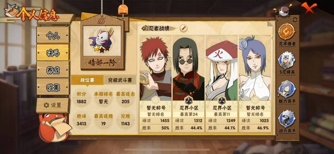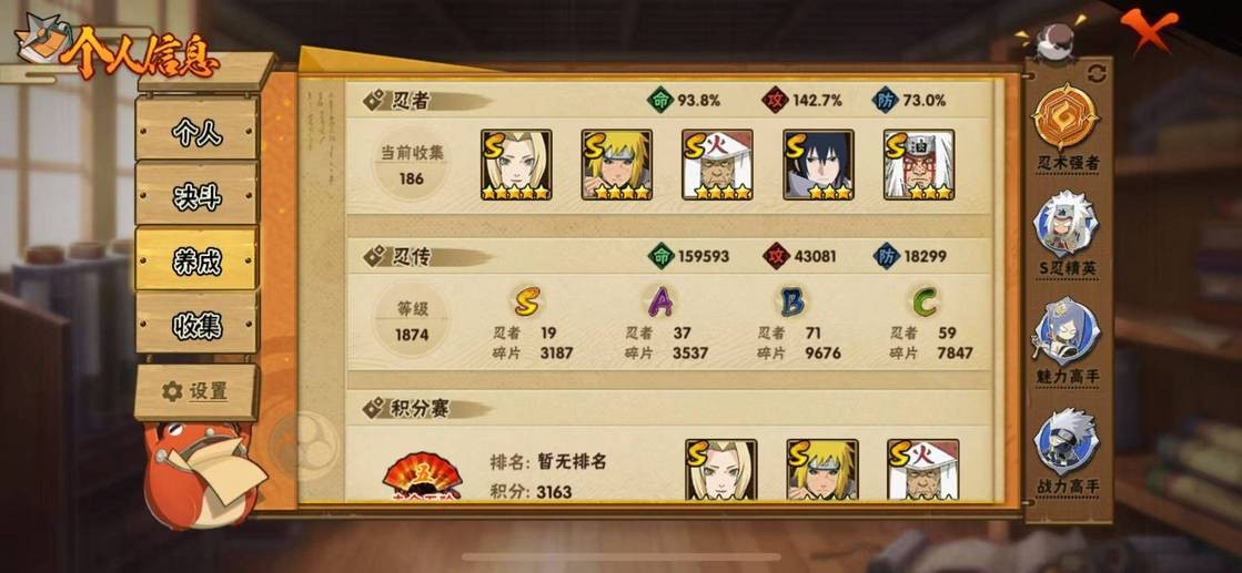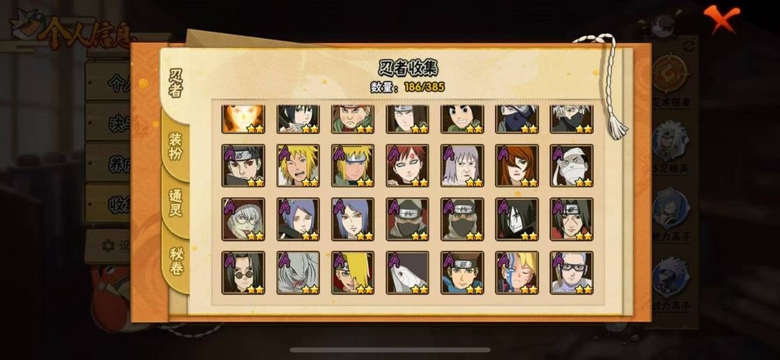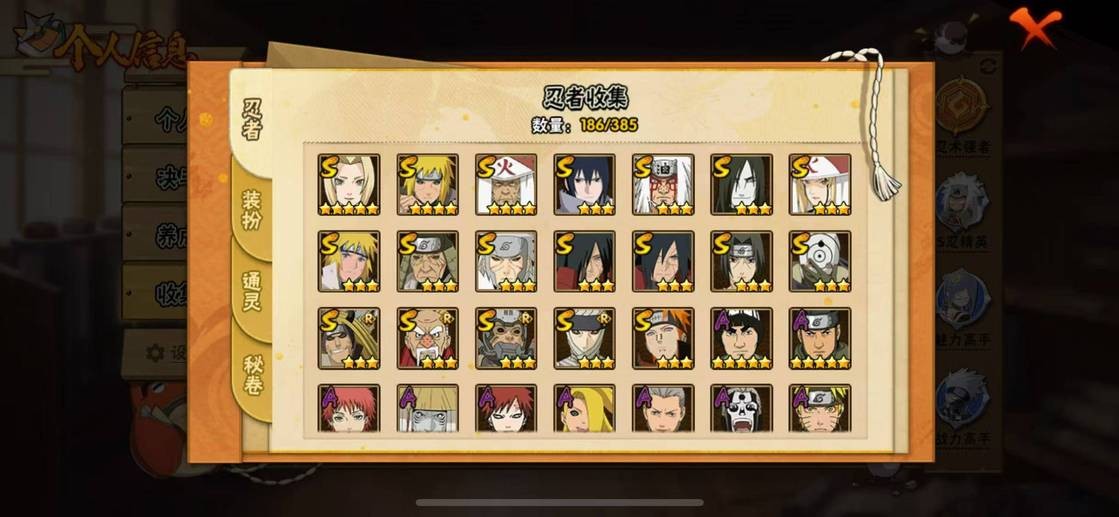 穢土半藏,金角銀角,穢土日斬,穢土水門,穢土扉間,穢土斑,穢土解斑,須佐鼬,二代土影,大野木,仙人自來也,大蛇丸,綱手,百豪綱手,三代火影,水門,永恆萬花筒佐助,白面具,新春水門,青年水門,迪達拉,穢土迪達拉,曉大蛇丸,飛段,死司飛段,鬼鮫,鮫肌融合鬼鮫,角都,地怨虞角都,凱,卡卡西,萬花筒卡卡西,忍戰丁次,近松十人衛千代,忍戰寧次,疾風傳我愛羅,忍戰我愛羅,桃式顯現博人,蠍,小南,仙人鳴人,九尾鳴人,泳裝小南,阿斯瑪,止水,鼬,暴怒帶土,須佐佐助,新春鼬,斗篷兜,六代水影,五代水影