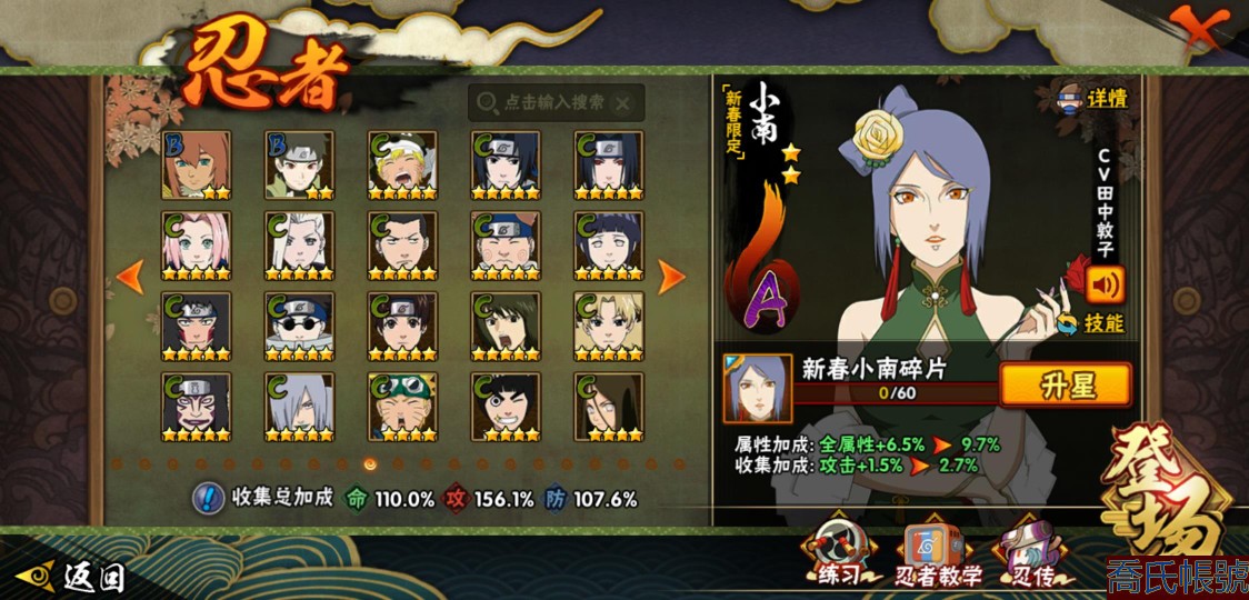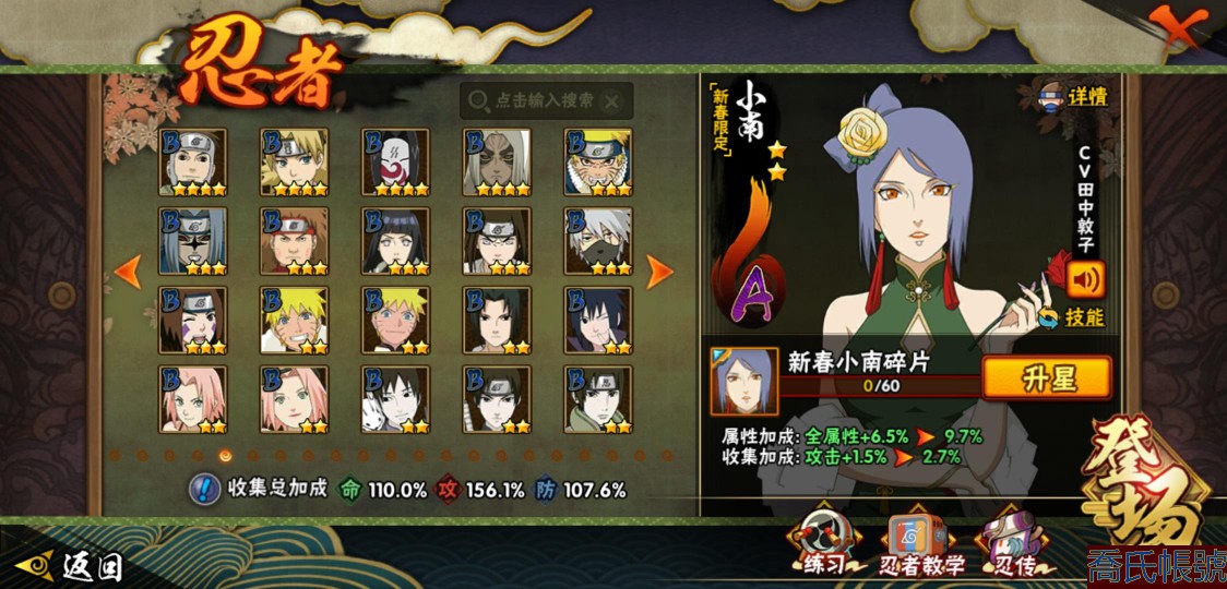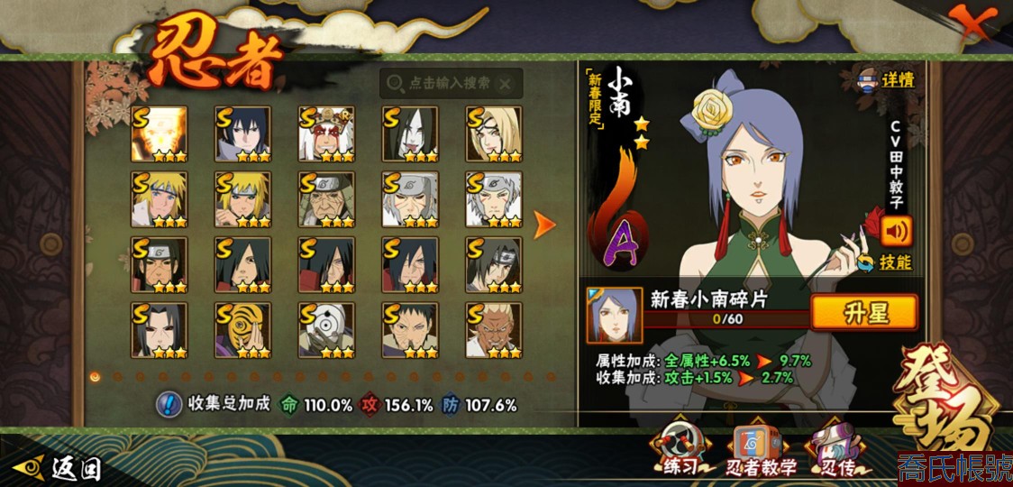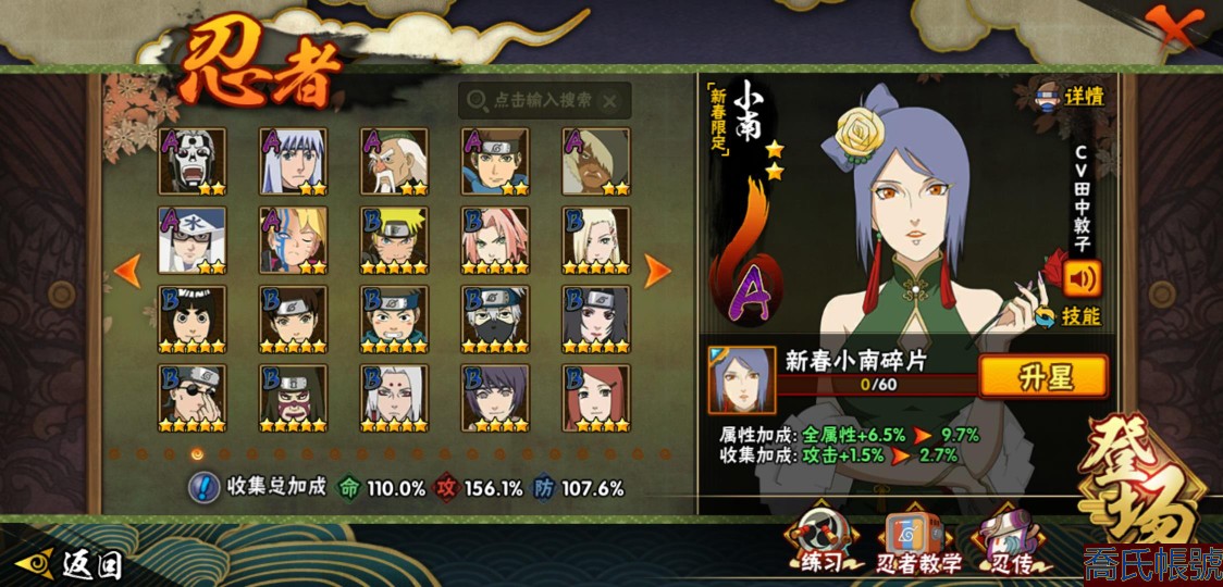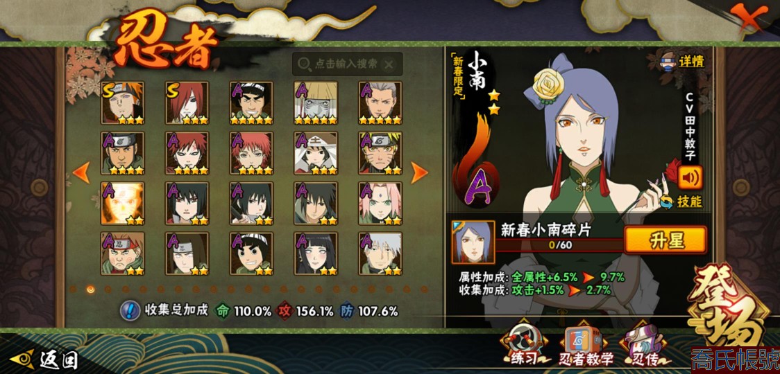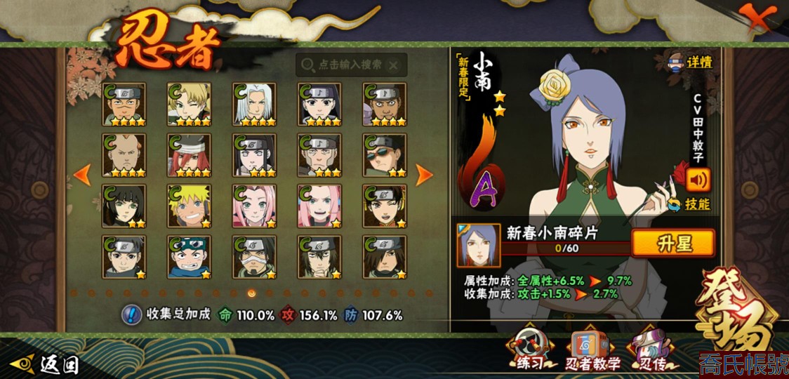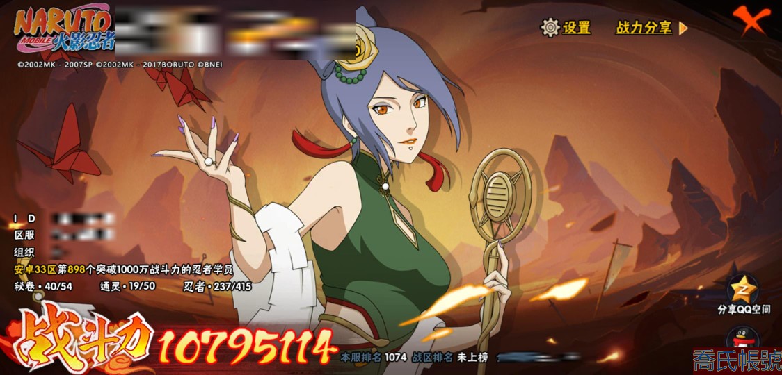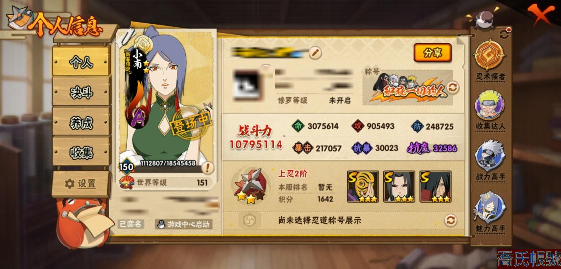 【11等】戰鬥力:1079W+;段位:上忍2階;本服排名:1074;戰區排名:未上榜;