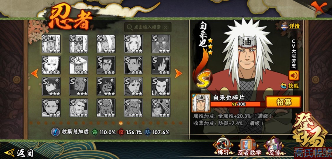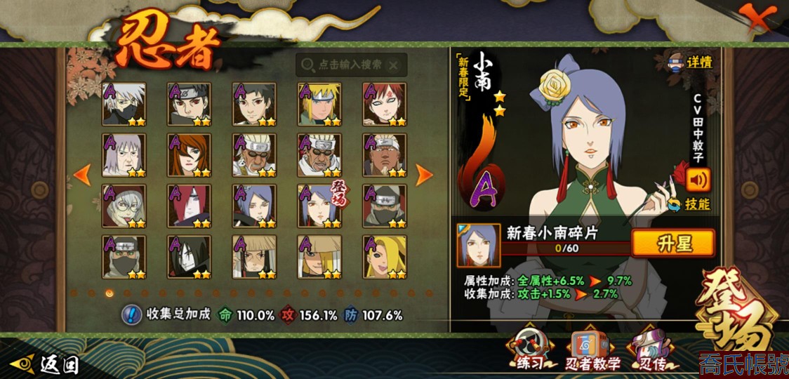 【OBHMWEL593842】戰鬥力:1079W+;段位:上忍2階;本服排名:1074;戰區排名:未上榜;VIP9級;S忍22個;A忍45個;通靈獸19個;S忍:九喇嘛連結漩渦鳴人,永恆萬花筒宇智波佐助,舞之豪傑自來也,大蛇丸,百豪綱手,波風水門,穢土轉生波風水門,穢土轉生猿飛日斬,穢土轉生千手扉間,千手扉間,穢土轉生千手柱間,宇智波斑,穢土轉生宇智波斑,穢土轉生解宇智波斑,須佐能乎宇智波鼬,穢土轉生宇智波鼬,神秘面具男,白面具宇智波斑,忍界大戰宇智波帶土,忍界大戰艾,天道佩恩,穢土轉生長門;A忍:邁特凱(5星),幹柿鬼鮫(5星),飛段(5星),猿飛阿斯瑪(4星),疾風傳我愛羅(4星),蠍(4星),四代目土影黑土(3星),仙人模式漩渦鳴人,九尾查克拉漩渦鳴人,萬花筒寫輪眼宇智波佐助,須佐能乎宇智波佐助,宇智波泉奈,百豪春野櫻,忍界大戰秋道丁次,忍界大戰日向寧次,忍界大戰李洛克,最終章日向雛田,幻之真容旗木卡卡西,萬花筒寫輪眼旗木卡卡西,宇智波止水,新春限定宇智波止水,青年波風水門,忍界大戰我愛羅,近松十人衛千代,五代目水影照美冥,忍界大戰奇拉比,奇拉比,青年艾,半蛇斗篷藥師兜,青年長門,小南,新春限定小南,角都,地怨虞角都,曉大蛇丸,宇智波鼬,迪達拉,穢土轉生迪達拉,死司憑血飛段,加藤斷,俠隱江湖大野木,猿飛木葉丸,五代目雷影達魯伊,六代目水影長十郎,桃式顯現漩渦博人;通靈獸:忍犬,藍蛇,蛤蟆吉,忍龜,鐮鼬,猿魔,山椒魚,蜃,蛤蟆仙人,鮫鯊,蛤蟆健,烏鴉,蛤蟆龍,蛤蟆廣,砂之守鶴,夢貘,蛞蝓俠隱江湖,蛞蝓,鷹;時裝:百戰佩恩天道,蜀面豪傑舞之豪傑自來也,百戰宇智波鼬須佐能乎,百戰波風水門,百戰大蛇丸,傳說的光芒波風水門,龍的傳人李洛克截拳宗師,編織虛實宇智波鼬,可愛睡衣漩渦鳴人,飛瀑流泉長十郎六代目水影,烈土霓裳黑土四代目土影,熊貓少女天天峨眉宗師,純白之心白,剎那的藝術迪達拉,血霧怪人幹柿鬼鮫;【33區】