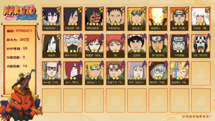 【HYN2411】V9/戰力390W/S忍9/A忍14/舞之豪傑自來也/疾風傳我愛羅/死司飛段/元氣卡卡西/永恆萬花筒佐助/凱/青年長門/紅夜帶土/忍戰帶土/蠍/斗篷兜/天道/阿斯瑪/水門/九鳴人/忍戰丁次/鬼鮫/大蛇丸/桃式顯現博人/穢土解斑/近松十人衛千代/六代水影/青年水門