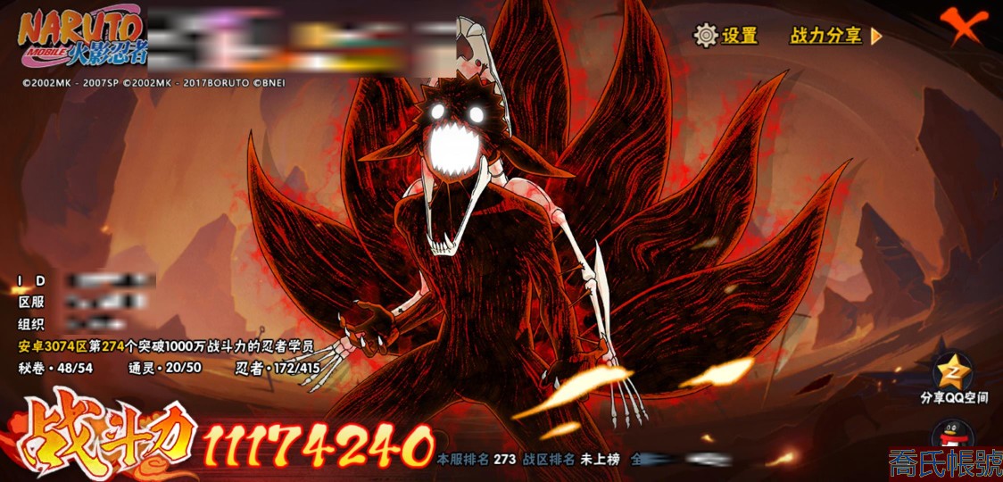 【11等】戰鬥力:1117W+;段位:上忍3階;本服排名:273;戰區排名:未上榜;V