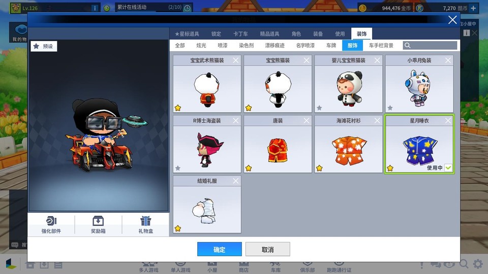 服飾共7套永久(星月睡衣、海灘花襯衫、睏寶熊貓裝、睏寶武術熊貓裝、寶貝睏寶熊貓裝、囡囡月兔裝、R博士海盜裝、唐裝、結婚禮服)
