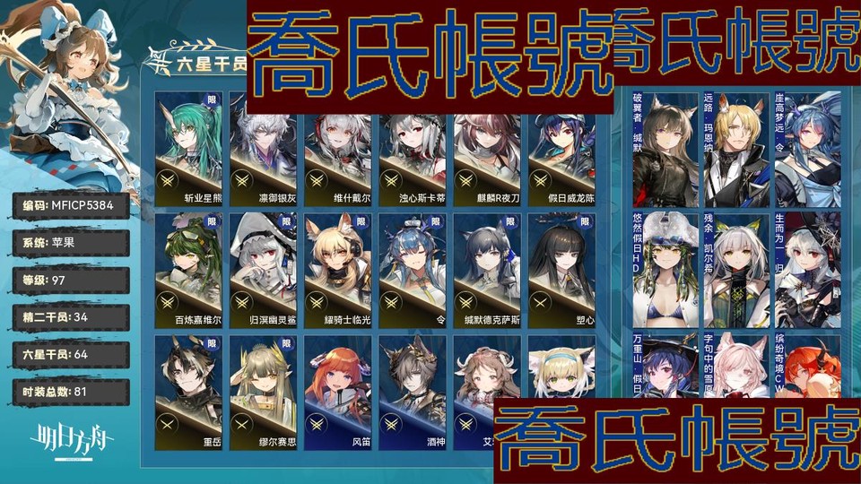 【OBMFICP538442】97級,64六星,34精二,7精一,合成玉數量:14908,源石數量:54,聯動幹員數量:5,時裝數量:81,精二六星:斬業星熊,風笛,酒神,凜御銀灰,維什戴爾,艾雅法拉,鈴蘭,萊伊,濁心斯卡蒂,凱爾希,銀灰,焰影葦草,遙,鴻雪,煌,流明,夜鶯,麒麟R夜刀,假日威龍陳,Mon3tr,電弧,泥岩,百鍊嘉維爾,聖聆初雪,塞雷婭,歸溟幽靈鯊,山,耀騎士臨光,令,瑪恩納,緘默德克薩斯,史爾特爾,伊芙利特,棘刺;精一六星:提豐,塑心,重嶽,號角,星熊,傀影,繆爾賽思;六星幹員:斬業星熊,風笛,酒神,凜御銀灰,維什戴爾,艾雅法拉,鈴蘭,萊伊,濁心斯卡蒂,凱爾希,銀灰,焰影葦草,遙,鴻雪,煌,流明,夜鶯,麒麟R夜刀,假日威龍陳,Mon3tr,電弧,泥岩,百鍊嘉維爾,聖聆初雪,塞雷婭,歸溟幽靈鯊,山,耀騎士臨光,令,瑪恩納,緘默德克薩斯,史爾特爾,伊芙利特,棘刺,提豐,塑心,重嶽,號角,星熊,傀影,繆爾賽思,溯光星源,弒君者,淬羽赫默,歌蕾蒂婭,溫蒂,阿,燭煌,魔王,早露,黑鍵,薇薇安娜,司霆驚蟄,卡涅利安,斥罪,能天使,伺夜,止頌,赫德雷,帕拉斯,斯卡蒂,聖約送葬人,赫拉格,黑;聯動幹員:九色鹿,三角初華,羅小黑,若葉睦,泰拉大陸調查團;時裝:破翼者·緘默德克薩斯,遠路·瑪恩納,崖高夢遠·令,悠然假日HD26·百鍊嘉維爾,殘餘·凱爾希,生而為一·歸溟幽靈鯊,萬重山·假日威龍陳,字句中的雪原·鴻雪,繽紛奇境CW03·史爾特爾,焦點·傀影,昇華·濁心斯卡蒂,悠然假日HD29·安比爾,糖果暴擊·奧達,遺蹟遊學者·驚蟄,星櫞林·流星,晴日·卡緹,競技之夢改裝·正義騎士號,奇工妙想·星極,化花·號角,衣縷往昔·梓蘭,山川的釀造·帕拉斯,雪霽·鈴蘭,火樹靈·布丁,枝頭馥·夜半,燦海浮夢·流明,繪聲繪影·深海色,風雪邀請·史都華德,遙鄉之徑·夏櫟,組間休息·布洛卡,偽裝·宴,春之頌·鈴蘭,夏卉FA374·羅比菈塔,無痕行者·安德切爾,返航·歌蕾蒂婭,破冰·霜葉,超級斷罪朋友·斷罪者,幽谷奏鳴·石棉,未完成的禮物·豆苗,海岸救援改裝·Lancet-2,黑曜石·泥岩,妙手玄心·阿,縱身一躍·傑克,待晴日·深靛,悠然假日HD31·華法琳,安息處的怪盜·卡達,夏卉FA026·蘇蘇洛,夏卉FA018·艾雅法拉,愜意·棘刺,淺灘律動·藍毒,爆裂菲林·煌,自由失效·史爾特爾,荒原行者·普羅旺斯,古堡清潔專家·阿消,探尋者SKm01·銀灰,霜息·赫默,皇后一號·風笛,遺石·推進之王,八音蛋匠人·格雷伊,幽靜·白麵鴞,見習聯結者·阿米婭,輓歌·夜鶯,堅城·塞雷婭,約克的寒風·銀灰,小鬼當家·暗索,未知的旅行·遠山,威塞克斯的信件·玫蘭莎,報童·阿米婭,十字郡·芬,守歲人·芙蓉,SUM019.ver·Castle-3,悠然假日HDm06·安賽爾;【蘋果】【官方賬號】