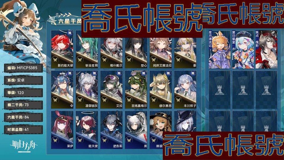 【OBMFICP538542】120級,84六星,73精二,5精一,合成玉數量:11856,源石數量:64,聯動幹員數量:13,時裝數量:41,精二六星:萊伊,能天使,新約能天使,邏各斯,黑,琳琅詩懷雅,歌蕾蒂婭,澄閃,斥罪,流明,刻俄柏,林,司霆驚蟄,推進之王,溫蒂,凱爾希,菲亞梅塔,老鯉,蕾繆安,霍爾海雅,斬業星熊,魔王,早露,電弧,維什戴爾,號角,艾麗妮,真言,伊芙利特,陳,史爾特爾,塞雷婭,夜鶯,伊內絲,阿,山,聖約送葬人,塑心,斯卡蒂,棘刺,忍冬,閃靈,星熊,薇薇安娜,赫德雷,純燼艾雅法拉,焰影葦草,黍,鈴蘭,銀灰,阿斯卡綸,泥岩,酒神,令,維娜·維多利亞,遙,風笛,琴柳,凜御銀灰,艾拉,鐧,白鐵,百鍊嘉維爾,赫拉格,安潔莉娜,多蘿西,煌,艾雅法拉,左樂,繆爾賽思,瑪恩納,豐川祥子,烏爾比安;精一六星:淬羽赫默,帕拉斯,弒君者,卡涅利安,焰尾;六星幹員:萊伊,能天使,新約能天使,邏各斯,黑,琳琅詩懷雅,歌蕾蒂婭,澄閃,斥罪,流明,刻俄柏,林,司霆驚蟄,推進之王,溫蒂,凱爾希,菲亞梅塔,老鯉,蕾繆安,霍爾海雅,斬業星熊,魔王,早露,電弧,維什戴爾,號角,艾麗妮,真言,伊芙利特,陳,史爾特爾,塞雷婭,夜鶯,伊內絲,阿,山,聖約送葬人,塑心,斯卡蒂,棘刺,忍冬,閃靈,星熊,薇薇安娜,赫德雷,純燼艾雅法拉,焰影葦草,黍,鈴蘭,銀灰,阿斯卡綸,泥岩,酒神,令,維娜·維多利亞,遙,風笛,琴柳,凜御銀灰,艾拉,鐧,白鐵,百鍊嘉維爾,赫拉格,安潔莉娜,多蘿西,煌,艾雅法拉,左樂,繆爾賽思,瑪恩納,豐川祥子,烏爾比安,淬羽赫默,帕拉斯,弒君者,卡涅利安,焰尾,伺夜,空弦,溯光星源,信仰攪拌機,異客,止頌;聯動幹員:閃擊,若葉睦,三角初華,艾拉,豐川祥子,導火索,醫生,戰車,祐天寺若麥,八幡海鈴,霜華,九色鹿,雙月;時裝:星月漂流記·克洛絲,夏日餮宴·水月,焦點·傀影,糖果暴擊·奧達,家傳秘方·暴行,最初的頌歌·PhonoR-0,沉思之庭·赫德雷,單刀·炎客,星櫞林·流星,悠然假日HDm57·褐果,競技之夢改裝·正義騎士號,衣縷往昔·梓蘭,遙鄉之徑·夏櫟,破冰·霜葉,海岸救援改裝·Lancet-2,妙手玄心·阿,自由失效·史爾特爾,少尉·杜賓,皇后一號·風笛,見習聯結者·阿米婭,光影·夜魔,遺石·推進之王,枯柏·守林人,夏卉FA661·宴,兒童派對·伊芙利特,快樂衛士·卡緹,威塞克斯的信件·玫蘭莎,SUM019.ver·Castle-3,報童·阿米婭,守歲人·芙蓉,十字郡·芬,寒冬信使·德克薩斯,漆匠·赫默,小鬼當家·暗索,悠然假日HDm06·安賽爾,植物種志·調香師,辛味·末藥;【官方賬號】