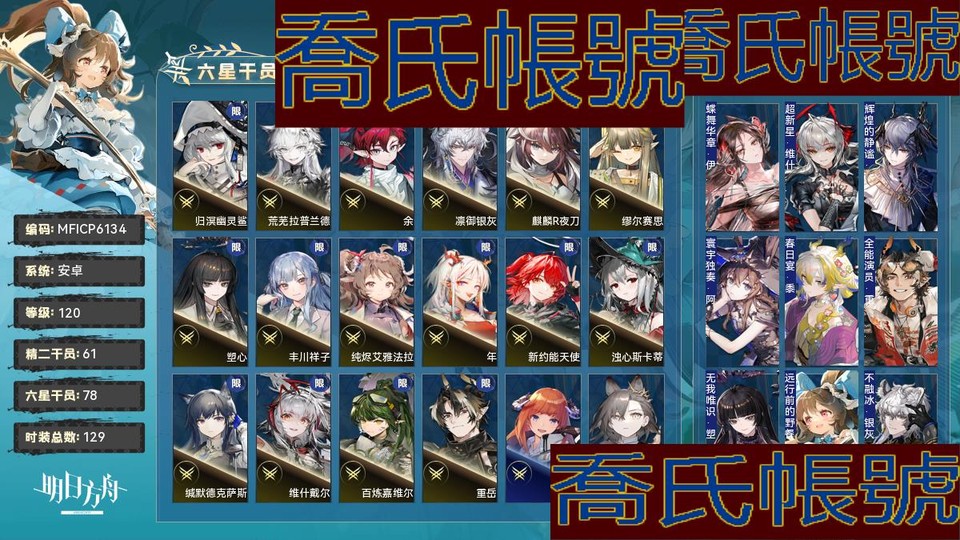 【OBMFICP613442】120級,78六星,61精二,1精一,合成玉數量:7820,源石數量:16,聯動幹員數量:8,時裝數量:129,精二六星:風笛,斥罪,Mon3tr,赫德雷,歸溟幽靈鯊,空弦,能天使,荒蕪拉普蘭德,邏各斯,烏爾比安,莫斯提馬,塞雷婭,鈴蘭,銀灰,伊芙利特,斯卡蒂,靈知,琴柳,麥哲倫,餘,澄閃,森蚺,凜御銀灰,提豐,山,鴻雪,艾雅法拉,酒神,推進之王,麒麟R夜刀,繆爾賽思,塑心,流明,真言,凱爾希,豐川祥子,棘刺,歌蕾蒂婭,刻俄柏,燭煌,蕾繆安,純燼艾雅法拉,司霆驚蟄,黑,伊內絲,泥岩,年,焰影葦草,新約能天使,電弧,黑鍵,濁心斯卡蒂,瑪恩納,緘默德克薩斯,娜仁圖亞,維什戴爾,引星棘刺,煌,史爾特爾,百鍊嘉維爾,重嶽;精一六星:信仰攪拌機;六星幹員:風笛,斥罪,Mon3tr,赫德雷,歸溟幽靈鯊,空弦,能天使,荒蕪拉普蘭德,邏各斯,烏爾比安,莫斯提馬,塞雷婭,鈴蘭,銀灰,伊芙利特,斯卡蒂,靈知,琴柳,麥哲倫,餘,澄閃,森蚺,凜御銀灰,提豐,山,鴻雪,艾雅法拉,酒神,推進之王,麒麟R夜刀,繆爾賽思,塑心,流明,真言,凱爾希,豐川祥子,棘刺,歌蕾蒂婭,刻俄柏,燭煌,蕾繆安,純燼艾雅法拉,司霆驚蟄,黑,伊內絲,泥岩,年,焰影葦草,新約能天使,電弧,黑鍵,濁心斯卡蒂,瑪恩納,緘默德克薩斯,娜仁圖亞,維什戴爾,引星棘刺,煌,史爾特爾,百鍊嘉維爾,重嶽,信仰攪拌機,滌火傑西卡,魔王,弒君者,林,早露,卡涅利安,淬羽赫默,琳琅詩懷雅,多蘿西,溯光星源,白鐵,赫拉格,止頌,伺夜,艾麗妮,薇薇安娜;聯動幹員:八幡海鈴,三角初華,若葉睦,祐天寺若麥,豐川祥子,九色鹿,羅小黑,泰拉大陸調查團;時裝:蝶舞華章·伊內絲,超新星·維什戴爾,輝煌的靜謐·邏各斯,寰宇獨奏·阿米婭,春日宴·黍,全能演員·重嶽,無我唯識·塑心,遠行前的野餐·純燼艾雅法拉,不融冰·銀灰,新枝·繆爾賽思,紅女爵·濁心斯卡蒂,破翼者·緘默德克薩斯,遠路·瑪恩納,悠然假日HD26·百鍊嘉維爾,殘餘·凱爾希,生而為一·歸溟幽靈鯊,字句中的雪原·鴻雪,夏日餮宴·水月,繽紛奇境CW03·史爾特爾,焦點·傀影,昇華·濁心斯卡蒂,悠然假日HD71·寒檀,旋律的主人·豐川祥子,籠中歌者·三角初華,提線的本我·若葉睦,火種·火神,玩伴·紅雲,糖果暴擊·奧達,家傳秘方·暴行,甜美配方·妮芙,玫瑰騎手·維荻,最初的頌歌·PhonoR-0,拭刀·刻刀,封面傭兵·石英,斜照·折光,礫瓦·泥岩,相位面容·錫人,花房茶話會·澄閃,地底三百米·暴行,我即潮汐·歌蕾蒂婭,記敘·斥罪,單刀·炎客,星櫞林·流星,晴日·卡緹,北地引路人·提豐,命運主宰·多蘿西,悠然假日HD49·錫蘭,棠雲巧夢·子月,悠然假日HDm57·褐果,夏卉FA317·琴柳,競技之夢改裝·正義騎士號,下一頓午茶·斯卡蒂,飛羽·艾麗妮,悠然假日HD29·安比爾,衣縷往昔·梓蘭,奇工妙想·星極,枝頭馥·夜半,山川的釀造·帕拉斯,火樹靈·布丁,廊下游·寒芒克洛絲,燦海浮夢·流明,燈如晝·曉歌,面紗之下·獅蠍,喜夜侍者·澄閃,繪聲繪影·深海色,未講述的故事·埃拉託,風雪邀請·史都華德,遙鄉之徑·夏櫟,春之頌·鈴蘭,夏卉FA374·羅比菈塔,組間休息·布洛卡,偽裝·宴,無痕行者·安德切爾,讀者·山,如歌·空,夏卉FA210·羽毛筆,夏卉FA641·夜半,幽谷奏鳴·石棉,破冰·霜葉,海岸救援改裝·Lancet-2,黑曜石·泥岩,無拘無束·刻俄柏,悠然假日HD31·華法琳,縱身一躍·傑克,榮耀之紫·鞭刃,宣傳策略·空弦,夏卉FA018·艾雅法拉,淺灘律動·藍毒,安息處的怪盜·卡達,爆裂菲林·煌,夏卉FA026·蘇蘇洛,輕風LB01·紅,靜謐午夜DN06·泥岩,天際線·黑,荒原行者·普羅旺斯,除魅·莫斯提馬,鐵律·塞雷婭,古堡清潔專家·阿消,模特之夜·礫,霜息·赫默,夏卉FA333·刻俄柏,燦陽朝露SD01·臨光,皇后一號·風笛,見習聯結者·阿米婭,遺石·推進之王,幽靜·白麵鴞,厚禮·黑,威塞克斯的信件·玫蘭莎,報童·阿米婭,未知的旅行·遠山,小鬼當家·暗索,十字郡·芬,暗流·幽靈鯊,夏卉FA011·古米,悠然假日HDm06·安賽爾;【官方賬號】