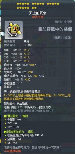 22c 天上氣息:上排30%智力 下排:等級+2 全屬5% 智力6% 價錢:14000元 4張B卷 (如圖)