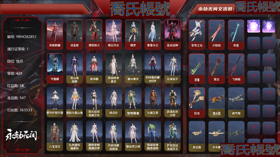 16紅547金|等級429|蝕月|幻絲363533|金磚1280|通行證Lv
