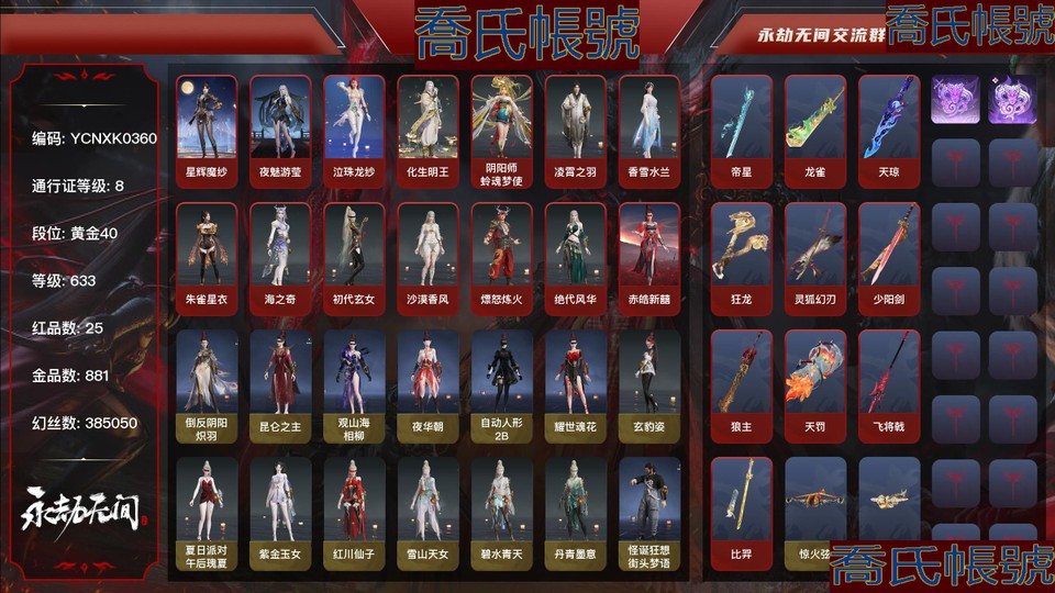 【YJYCNXK036011】25紅881金丨等級633丨黃金4丨金磚84丨幻絲385050丨通行證未升級Lv.8丨紅色神品:星輝魔紗,帝星,龍雀,天瓊,狂龍,靈狐幻刃,少陽劍,狼主,夜魅遊瑩,泣珠龍紗,化生明王,陰陽師·蛉魂夢使,凌霄之羽,香雪水蘭,朱雀星衣,海之奇,初代玄女,沙漠香風,熛怒煉火,絕代風華,墨離,天罰,飛將戟,赤皓新囍,比羿,變身器:珥冰,荊魂,2674·初代機,千秋匠心·兇虎,角色金色皮膚:倒反陰陽·熾羽,崑崙之主,觀山海·相柳,夜華朝,自動人形·2B,耀世魂花,玄豹姿,夏日派對·午後瑰夏,紫金玉女,紅川仙子,雪山天女,碧水青天,丹青墨意,怪誕狂想·街頭夢語,鬥羅大陸·唐三,噬月天狼,沙狼之怒,蒼狼之主,追獵,倒反陰陽·凜冬,巔峰極速·蕾雅,千秋匠心·玉葉景,長歌詩韻·胡旋女,觀山海·青鳥,神鷹之女,驚雲羽,浣煙紗,金羽聖鷹,蜃樓魅影,璨銀魔梟,瀚海蒼鷹,長歌詩韻·鷓鴣天,巫師3·傑洛特,巨闕,觀山海·夏神祝融,2674·街頭烈火,龍心熾焰,龍之影·精武魂,逆水寒·江海滄瀾,立天地,醉山川,江湖行,遊四海,巔峰極速·小可,長歌詩韻·遣唐使,日道神子,夏日派對·高校水著,山吹茶,輝燁少女,龍之道·至純,天鈿女命,御宅羅夢,陰陽姬,清雅少女,武道無窮·少林,若水尊者,梨園傳奇·法海,龍之影·生死局,覺之一念,淨金寶相,八寶龍王,裟伽龍王,陰陽師·赤影妖刀姬,汐淚,綠野守護·暗沼摩羅,阿娜希塔,楚韻九歌·湘夫人,觀山海·文鰩,巨鯨客,赤霧煙霞,夏日派對·弄潮逐浪,掌珠仙子,鎮海龍,複製體·尼爾,西行劫·楊戩,常勝袍,弘毅袍,華夏寶甲·漢光,龍之影·過江龍,守誓者,驍騎,封神錄·申公豹,司天命,幽篁山鬼,朝聞道,未濟袍,金羽客,若谷,祿運玉霄,封神錄·龍吉公主,自動人形·A2,藏雨閣主,夏日派對·仲夏霜華,梨園傳奇·小青,赤丹朱湛,寒英素雪,姑射真人,玄青鬱離,花之傾奇,蒼雷丸,夏日派對·長夏清瀾,智繪·萍之緣,蘭庭月,沐昭,新倩女幽魂·瑤光沐月,新倩女幽魂·流紈裙,P5R·奧村春NOIR,云溪仙子,綠野守護·悠竹萌客,夏日派對·初夏緋莓,綺雲衫,絮雲衣,福瑞天澤,葫蘆兄弟·蛤蟆頭領,街頭狂歡·不敗擂主,觀山海·秋神蓐收,西行劫·悟空,行空裘,干將莫邪,觀山海·冬神玄冥,無常白袍,春不斂,封神錄·妲己,護世四法·廣目天王,日影花陰,黃昏巫主,夜綢袍,長歌詩韻·念奴嬌,觀山海·獬豸,夏日派對·半夏晚風,湛盧,虹貓藍兔七俠傳·虹貓,封神錄·姜子牙,綠野守護·山漠獰影,天虹詠,雪鈴綺歌,虹貓藍兔七俠傳·藍兔,長歌詩韻·如夢令,真的抱歉,白菜頭,自動人形·埃米爾,劫杯·戰神,玄陶俑面·女,目瞪馬呆·女,雁落笠,魂花耀,一品紅,崑崙龍神冠,競無間·女,紅絨暖·女,西行劫·蛛絲墜,搖清楓,玄陶俑面·男,目瞪馬呆·男,美團·團上頭了,植物大戰殭屍2·腦子給我,粽香遠,紅絨暖·男,暖冬帽·男,天狼盔,暖冬帽·女,雪絨帽,燼焚之尊,巫師3·驢耳朵,甲辰龍,福虎帽,狐靈面,浮元子,天冠,立烏帽,炎流雲禪笠,安歌帽,雪鹿雌角,凱旋盔,華夏寶甲·漢榮,約誓盔,鳳尾皂金盔,則元冠,銀雪,癸卯兔,雪笠,寒酥銀粟,瓊花帽,麟鹿兜,上侍帽,魔燭帽,靈蘭,P5R·NOIR的帽子,怦然心動·喵彩,綠野守護·絨絨貓,夏日派對·兔兔髮箍,系雲瀾,妙法兜帽,觀山海·腓尾,虎絨耳,葫蘆兄弟·蛤蟆頭,街頭狂歡·制勝之道,觀山海·秋金,西行劫·緊箍兒,飛狐帽,毛氈笠,臥龍·呂布鐵面,_P5R·PANTHER面具,觀山海·冬稜,無祟,封神錄·傾城,醉狐銀,夢棠,季中賽2025·瀚沙,鳩羽帽,烏金帶,玄天冠,虹貓藍兔七俠傳·虹光,虹貓藍兔七俠傳·長風,玉蓮冠,金瑛冠,虹貓藍兔七俠傳·赤龍,夜露帽,盜墓筆記·防風帽,鹿鈴角,神愈之冕,虹貓藍兔七俠傳·寒月,虹貓藍兔七俠傳·落花,百戲碗,虹貓藍兔七俠傳·雪團,驟雷鏢旗,髮型金色皮膚:(挑染)雲霞發,縹緲發,簪纓發,蒼狼宗主發,鬥羅大陸·海神發,翔鸞發,夕鷹發,觀山海·青鸞發,(挑染)縹怒發,逆水寒·江海發,(挑染)水仙發,木棉發,月下香發,月丹發,緣覺發,(挑染)沸海發,弄潮發,碎浪發,激浪發,浩渺發,安瀾發,鯨海發,(挑染)覓封侯發,(挑染)清威發,九梁發,竹律發,天青發,冰凌發,閻摩發,(挑染)白芷發,子菀發,蘇木發,伏苓發,紫芙發,(挑染)千絲發,百靈發,韶光發,綠野守護·嬌憨發,觀山海·天刑發,(挑染)宵燭發,觀山海·冥泉發,流螢發,繾綣發,幽焰發,古溪發,封神錄·籠煙芍藥發,秀逸發,(挑染)玄冥發,結纓發,長歌詩韻·豪傑發,(挑染)風吹雪發,封神錄·仙風發,虹貓藍兔七俠傳·虹發,蜜語發,長歌詩韻·沉醉發,虹貓藍兔七俠傳·藍髮,冰鏈,武器金色皮膚:驚火弦,穿雲燕,天牛翼,千機弩,鎮海,雨歇,狂嘯,朱雀,沉默審判,綠野守護·雨幕,引冰落,金蠍,玉飛梭,螢火,出淵蛟,天心玉,雪國禮炮,雷落,鑽山,觀山海·嘉果花,造景,墨不歸,火羅衛,竹霹靂,貔貅吞寶,吞海鮫,玄武,龍息,龍嘯,丹鶴,凝冰魄,赤霞,長歌詩韻·夜觀燈,虎踞,迎宵,鸚鵡螺,爐中火,星追月,心魔,夢魘,烏木弓,豹胎易筋弓,劫渦·湧,轉輪弓,仙毫,風馳弓,青花,春水,日輝,腥紅之月,古月,蓮心劍雨,炎魔,2674·原型,虹貓藍兔七俠傳·長虹劍,虹貓藍兔七俠傳·冰魄劍,巫師3·湖女之劍,亢龍,明澈,隱鋒,監星尺,複製體·月光與黑暗,西行劫·紫金寶劍,俠骨·清光引,劫燼·煉,赤霄,燭神令,降龍木,鎮魔尺,福祿雙至,華夏神兵·永樂寶劍,壺中日月,含光承影,陰陽師·傘劍,殘陽,邪尾,暝視,金玉一文字,劫燼·燎,櫻華,念珠丸,雷賜,數珠丸,陰陽師·鬼切,劫燼·鍛,青石猊,破天,赤雲之刃,龍蟠,陰陽師·魂夢殘響,山君怒,魚化龍,