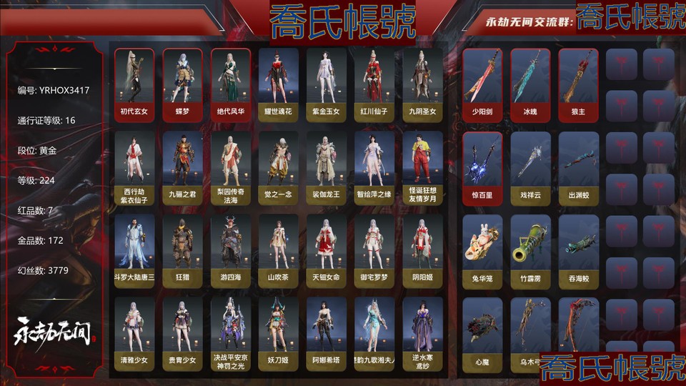 7紅172金|等級224|黃金|幻絲3779|金磚0|通行證Lv.16 紅色