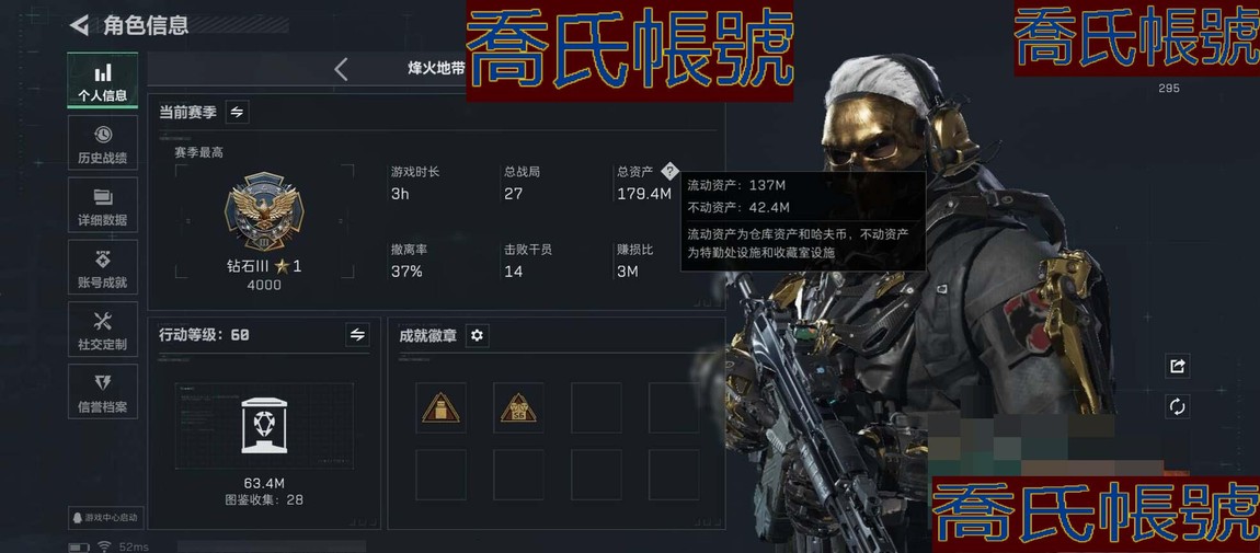 【11等】總資產:179M,哈夫幣:1024W,武器皮膚:59,烽火60級:戰場42級: