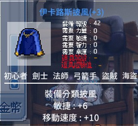 【6敏速披 伊卡路斯】42等/6敏/10速度/伊卡路斯披風/全職/弓箭手/劍士/海盜/盜賊
