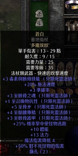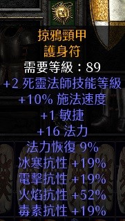 項鍊:2死靈10高施16法力+法力恢復9%+19全抗+52火抗(89級) 250