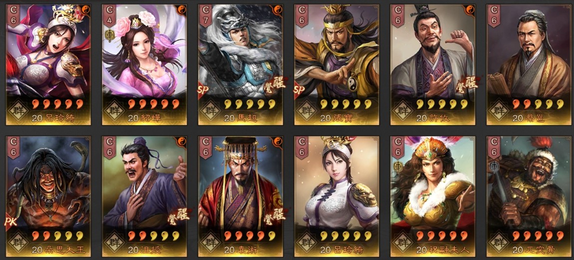 典藏:姜維 孫尚香 凌統 董卓 呂布 張飛 司馬懿 張遼 馬超 黃月英 曹操 關羽 朱儁 SP袁紹 孟獲 夏侯惇 魏延 黃忠 甘寧 太史慈 孫堅 呂玲綺 滿寵 鄧艾 諸葛恪 貂蟬 SP皇甫嵩 關興 呂蒙 龐德 張春華