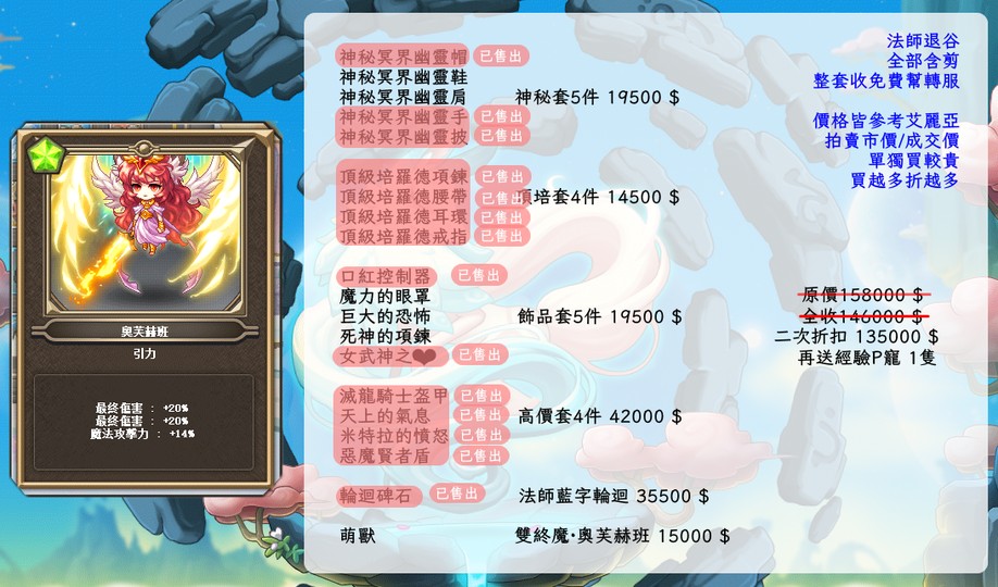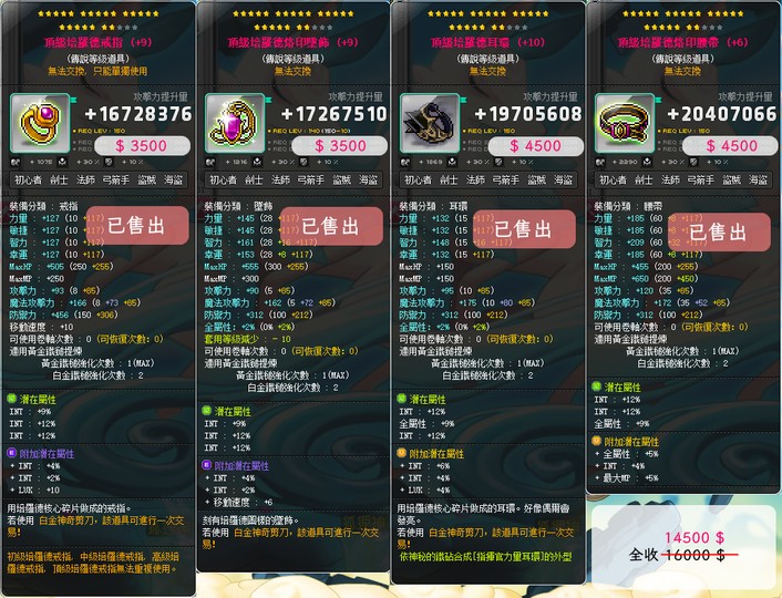 價格依照遊戲內拍賣價 (楓幣) 換算成 NT 計算