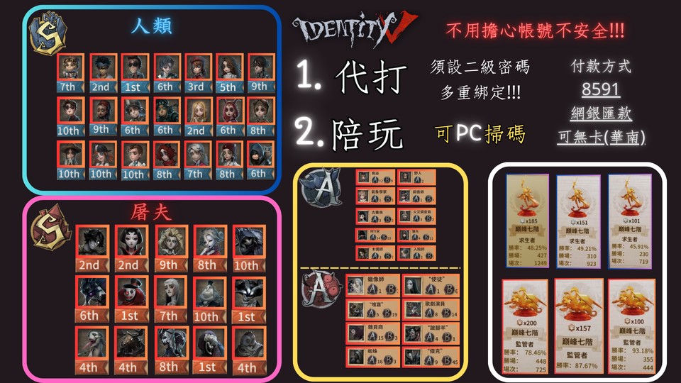 亞洲服【國際服】【8591最便宜第五人格代打】PS.酌收6%平台費