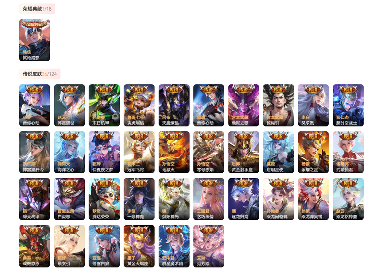 【WNLR4208】 典藏1 传说36 史诗130 限定131 英雄123 皮肤396 稀有英雄10 贵族0级 皮肤价值:308518