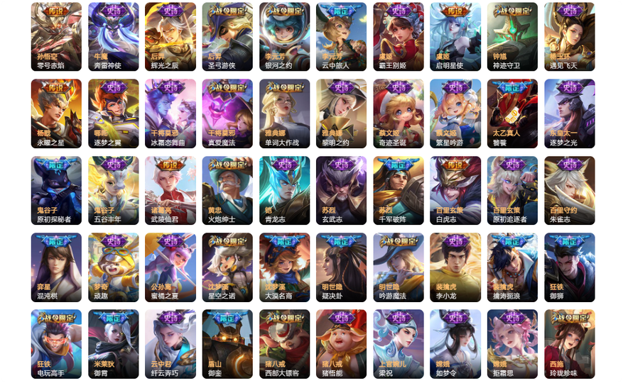 【史诗皮肤130】 海诺心动手记 金蝉唐三藏 上官婉儿群星魔术团 桑启奇遇星旅 孙膑寅虎展翼 鲁班七号电玩小子 嫦娥如梦令 芈月白晶晶 大乔乘龙忆丹青 安琪拉乘龙聚宝船 曹操夜都魔契 姬小满妄想食味 墨子龙骑士 安琪拉时之奇旅 艾琳奇遇舞章 哪吒雪上飞焰 夏洛特永昼 牛魔奔雷神使 周瑜雪夜绮愿 蒙犽百解令 钟馗乐园奇幻夜 大乔白蛇 公孙离无限星赏官 雅典娜黎明之约 嬴政暗夜贵公子 阿轲暗夜猫娘 不知火舞魅语 司空震地狱燃心 西施至美乘鲤谣 阿古朵江河有灵 项羽苍穹之光 赵怀真鹤归松栖 程咬金功夫厨神 沈梦溪月团寄思 橘右京修罗 娜可露露晚萤 百里玄策热力回旋 伽罗箭羽风息 蒙犽龙鼓争鸣 小乔青蛇 白起星夜王子 杨戬天秀启明 西施诗语江南 司马懿暗渊魔法 孙尚香时之恋人 曹操幽灵船长 戈娅驭风魔法 梦奇顽趣 元歌无心 鬼谷子五谷丰年 妲己女仆咖啡 赵云未来纪元 嬴政摇滚巨星 狂铁电玩高手 明世隐吟游魔法 宫本武藏鬼剑武藏 百里玄策原初追逐者 黄忠火炮绅士 刘禅绅士熊喵 亚瑟心灵战警 嫦娥拒霜思 廉颇地狱岩魂 干将莫邪真爱魔法 墨子金属风暴 庄周高山流水 猪八戒猪悟能 孙尚香水果甜心 云中君纤云弄巧 蒙犽狂想玩偶喵 甄姬冰雪圆舞曲 裴擒虎李小龙 马可波罗暗影游猎 公孙离蜜橘之夏 赵云引擎之心 百里守约朱雀志 兰陵王暗隐猎兽者 李元芳逐浪之夏 阿轲节奏热浪 百里守约特工魅影 吕布末日机甲 诸葛亮黄金分割率 花木兰瑞麟志 韩信白龙吟 孙悟空大圣娶亲 花木兰水晶猎龙者 露娜一生所爱 关羽冰锋战神 甄姬游园惊梦 庄周云端筑梦师 王昭君凤凰于飞 杨玉环遇见飞天 雅典娜冰冠公主 上官婉儿梁祝 妲己热情桑巴 狄仁杰鹰眼统帅 虞姬霸王别姬 鲁班七号狮舞东方 狄仁杰魔术师 妲己魅力维加斯 赵云皇家上将 李元芳银河之约 貂蝉逐梦之音 项羽霸王别姬 马可波罗逐梦之星 孙策猫狗日记 苏烈玄武志 安琪拉心灵骇客 大乔猫狗日记 哪吒逐梦之翼 干将莫邪冰霜恋舞曲 刘禅天才门将 裴擒虎梅西 小乔缤纷独角兽 蔡文姬奇迹圣诞 蔡文姬舞动绿茵 东皇太一逐梦之光 铠曙光守护者 铠青龙志 夏侯惇乘风破浪 韩信逐梦之影 蔡文姬繁星吟游 张飞乱世虎臣 孙悟空至尊宝 后羿辉光之辰 花木兰青春决赛季 刘邦德古拉伯爵 露娜紫霞仙子 貂蝉圣诞恋歌 李白千年之狐 吕布圣诞狂欢