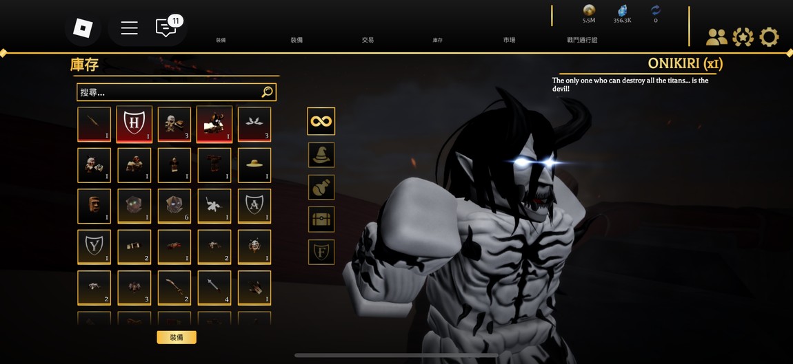 價格均標價在裡面,jotunn雷槍(600T)、oni 雷槍(600)、oni 刀(600)、forsaken skin(800)、Equinox moon(1200) 、Deus ex machina skin(800)、yeager(300)、ackerman(500)、helos(2500)、fritz(2500)、nichirin cleaver(600) 、vulcano caligorante(600)、adtolfos attire(600)、giyuus attire(600)、BAMBIETTA 翅膀(3000)、AZURE FLAMES(600)、COSMIC NOVA(700)、EXPLOSION ART(500)、IGNITED(600)、ARCHERS ATTIRE(300) 、REOGOKUS ATTIRE(300)、MAHORAGAS WHEEL(2500)、SOUL REAPERS ATTIRE(2000) 、KEY(10)、SCROLL(300)、SERUM(300)