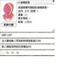 【刷帕莎納專用】+7連帽披肩Mhp+227;火屬性物理8%;人類怪物5%→未插卡
