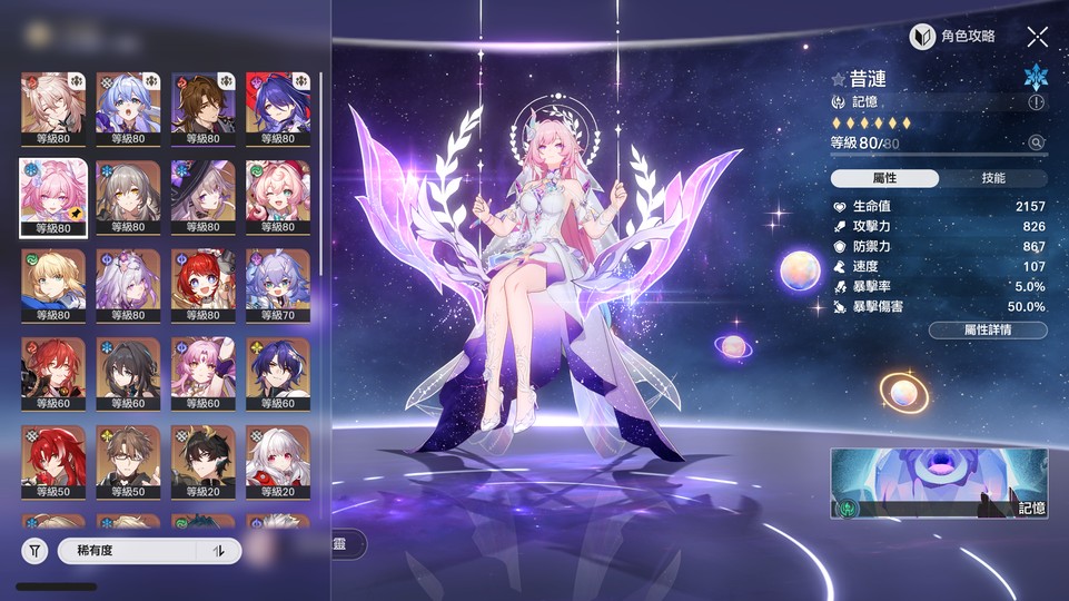 【女、70等、22金角、8金專】遐蝶 、黃泉 、大黑塔 、昔漣 、saber、風堇、知更鳥 、緹寶、椒丘、阮梅
