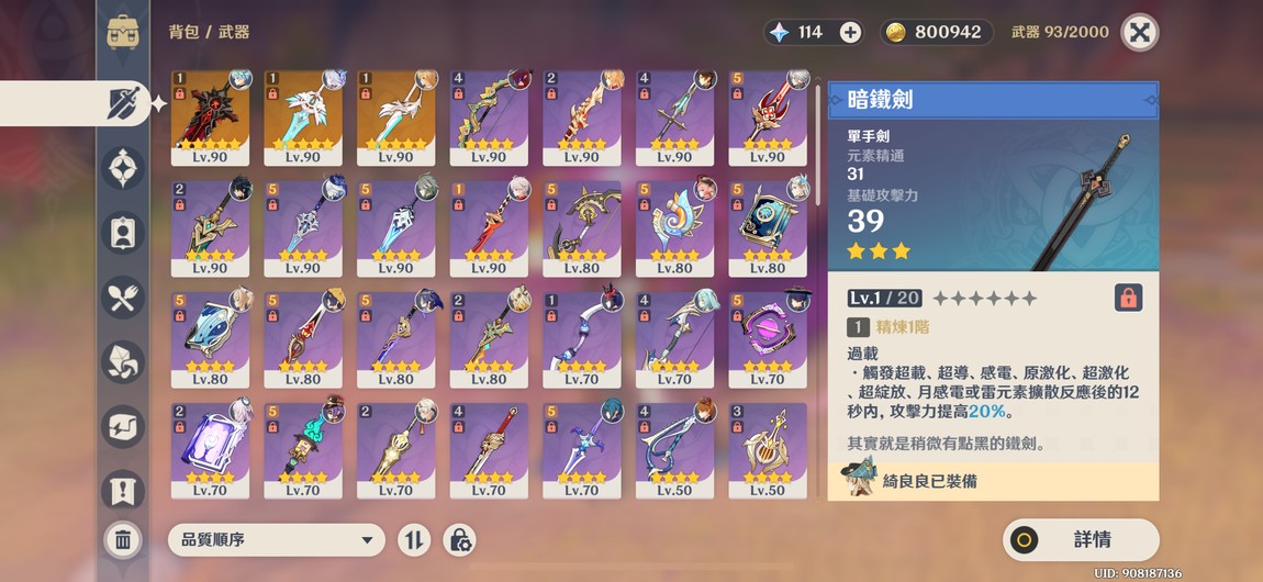 【男、50等、29金角、2金武】-玩家自售-多款五星角色(菈烏瑪、奈芙爾、菲林斯、水神等等),多款武器,誠可議價