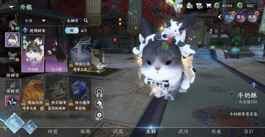 外觀:衣品31940,坐騎祥瑞(牛奶酥),霜天凝露(60)