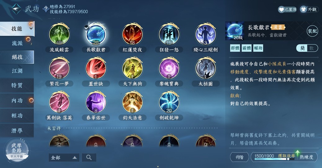 武功:長歌滿丶奶絕登峰,其餘群俠丶絕技丶百家都有(至少初傳)