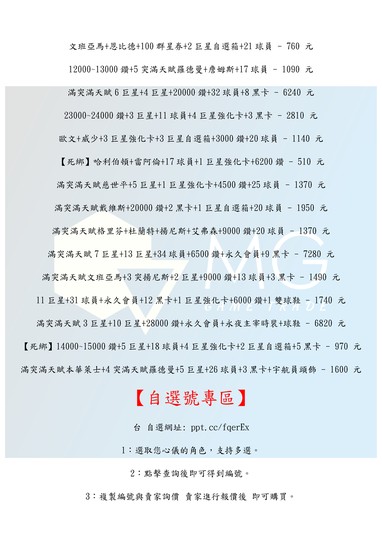 1.此為虚擬商品,不支持七天鑑賞期,介意勿購。 2.移交如有問題請勿更動帳號及綁定,請先聯繫賣家。 3.確認帳號無誤後,請依遊戲綁定方式更改密碼及綁定。 4.為避免交易糾紛,下單前請確認商品內容是否變更,未標示資源為隨機。 5.購買後14天內封號可保固退換 (發貨後開始計算時間), 14天後依封號原因判定,購買即視為同意此協議! 台 自選網址: ppt.cc/fqerEx