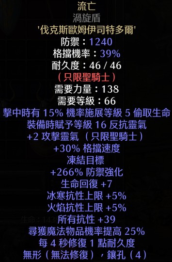 非天梯-流亡無形渦旋盾16靈氣/防禦1240/39全抗