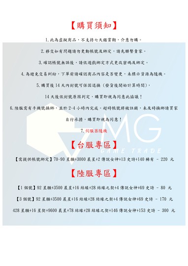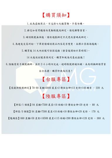1.此為虚擬商品,不支持七天鑑賞期,介意勿購。 2.移交如有問題請勿更動帳號及綁定,請先聯繫賣家。 3.確認帳號無誤後,請依遊戲綁定方式更改密碼及綁定。 4.為避免交易糾紛,下單前請確認商品內容是否變更,未標示資源為隨機。 5.購買後14天內封號可保固退換 (發貨後開始計算時間), 14天後依封號原因判定,購買即視為同意此協議!