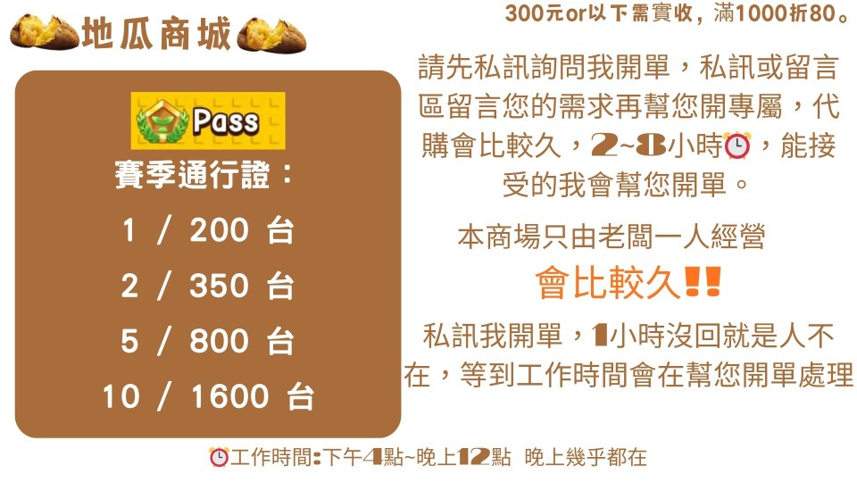 | 🌐刷經驗套餐(7隻貓頭鷹) | 200台幣 |