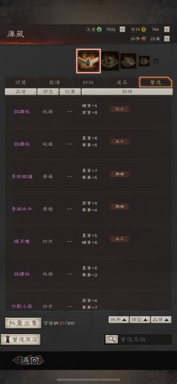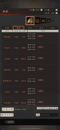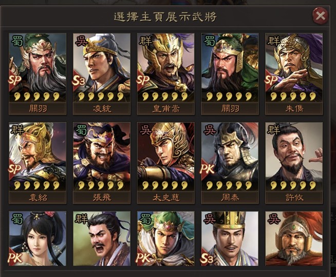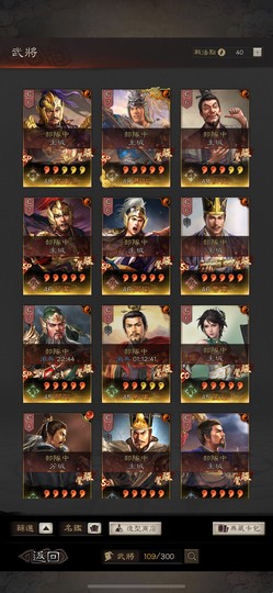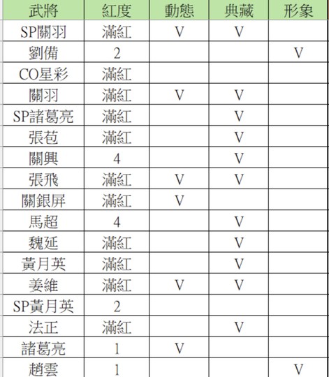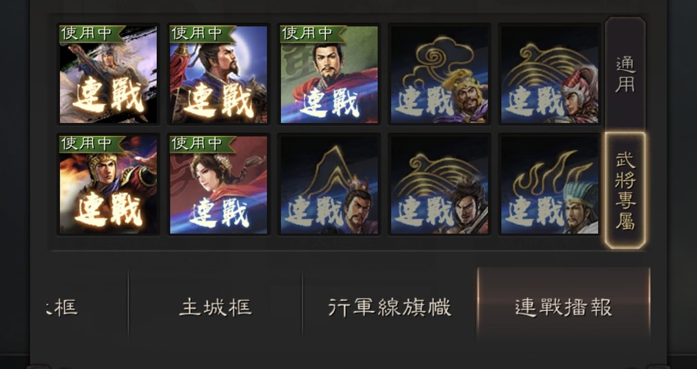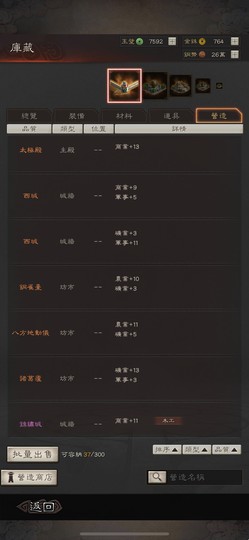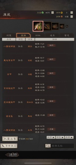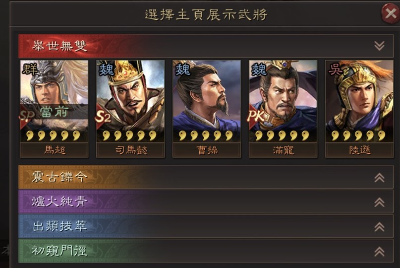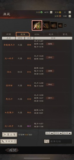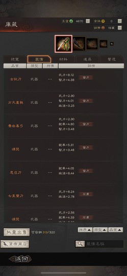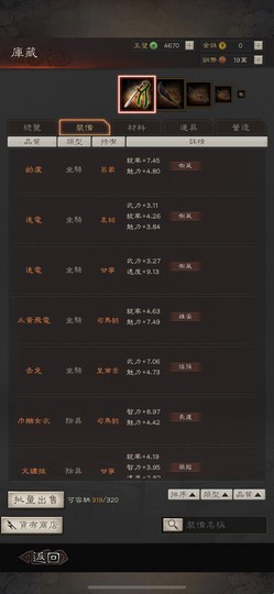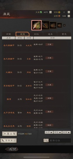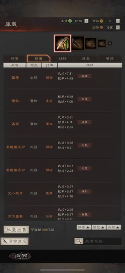 裝備:踩踏*2、援助*2、暴躁、雄烈、虎峙、龍驤、天公、華服、雄才、弓神、靈動*3、武聖*2、昭烈、神威、庸雅、長慮、精神,衝陣、護主、號令、奇算、長健,等等...看圖